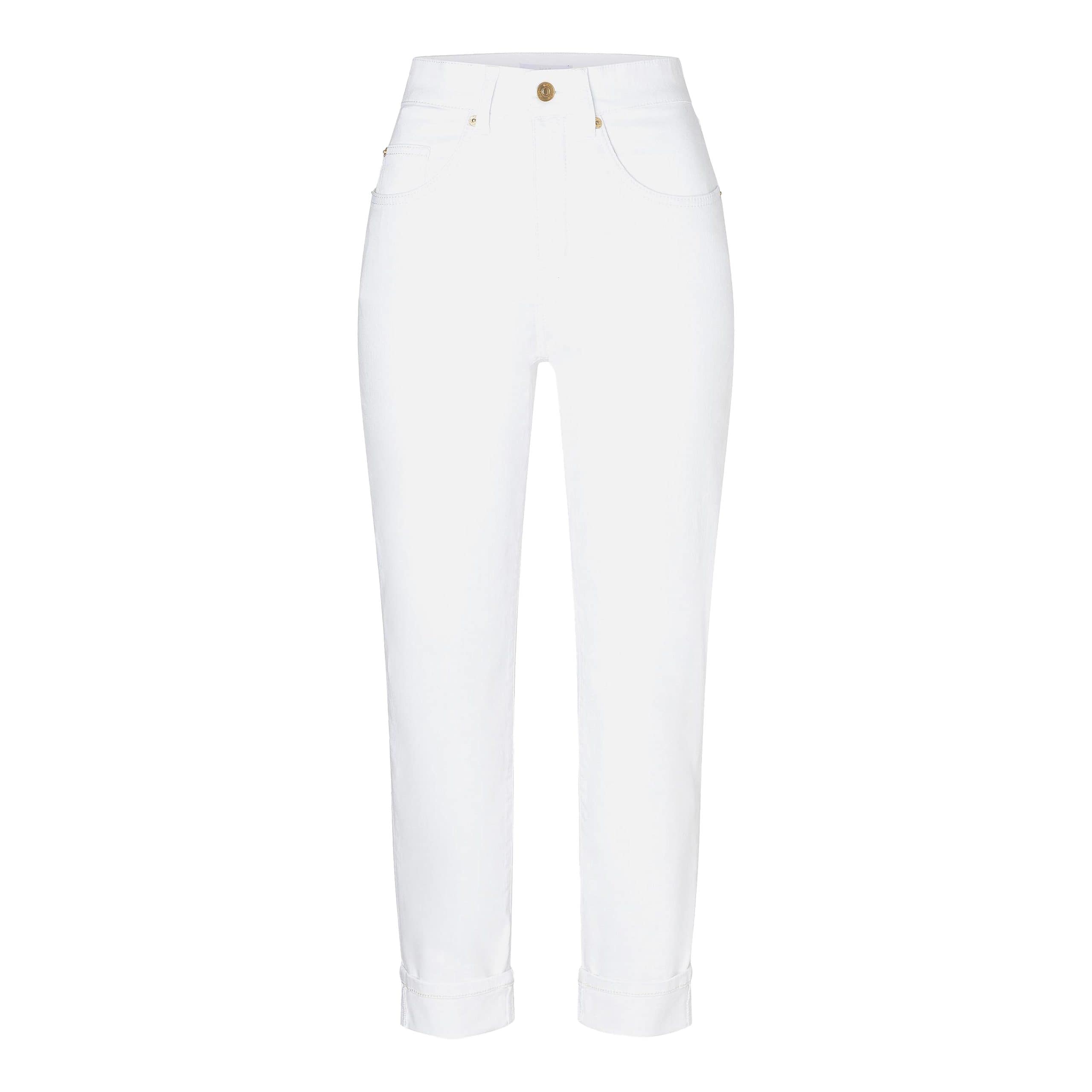 Witte jeans van MAC, model Carol, highwaist, carrot. Deze denim broek is gemaakt van stretch denim (lightweight), heeft twee steekzakken aan de voorzijde en twee achterzakken. De jeans sluit met een knoop- en ritssluiting en heeft een hoge taille met mom fit pasvorm.