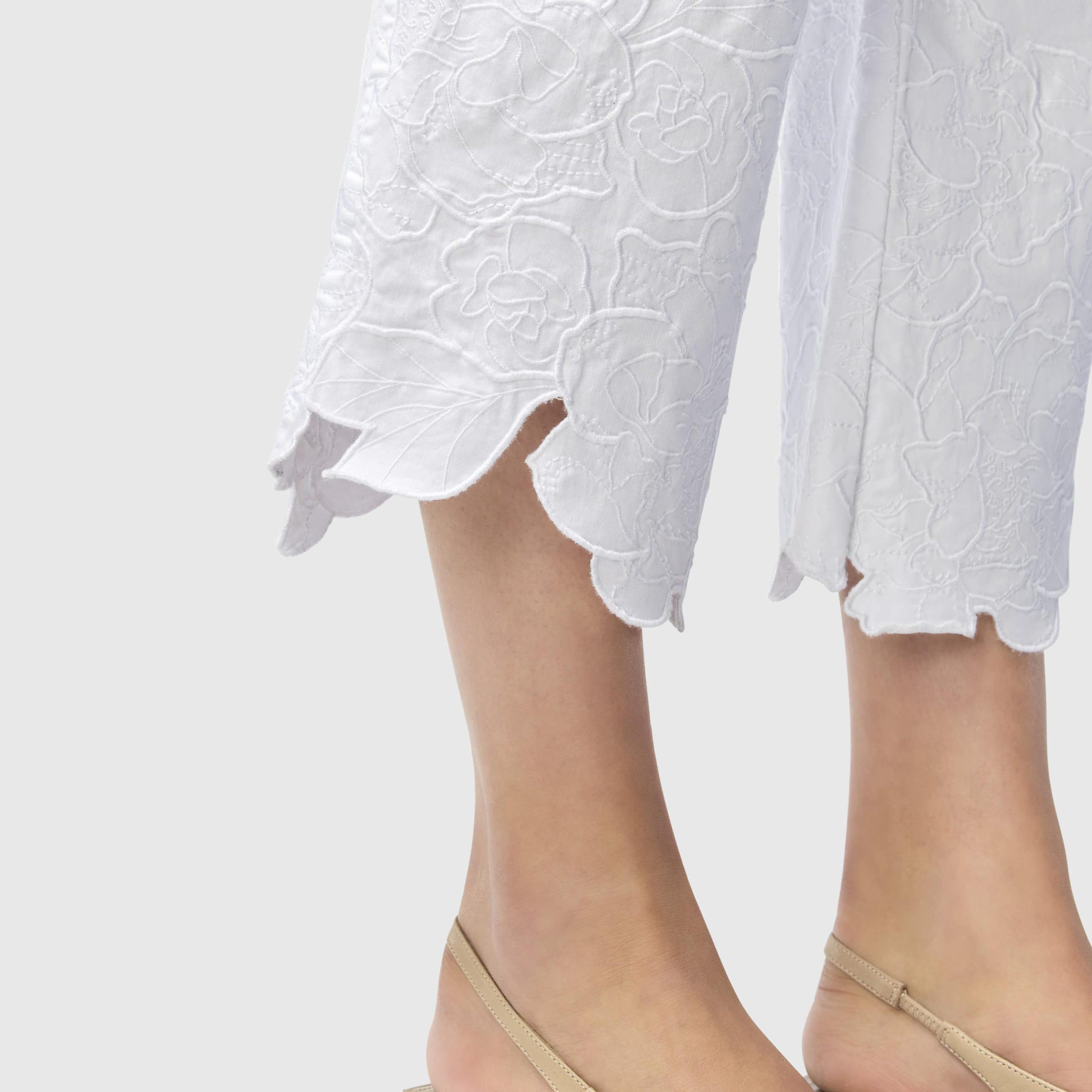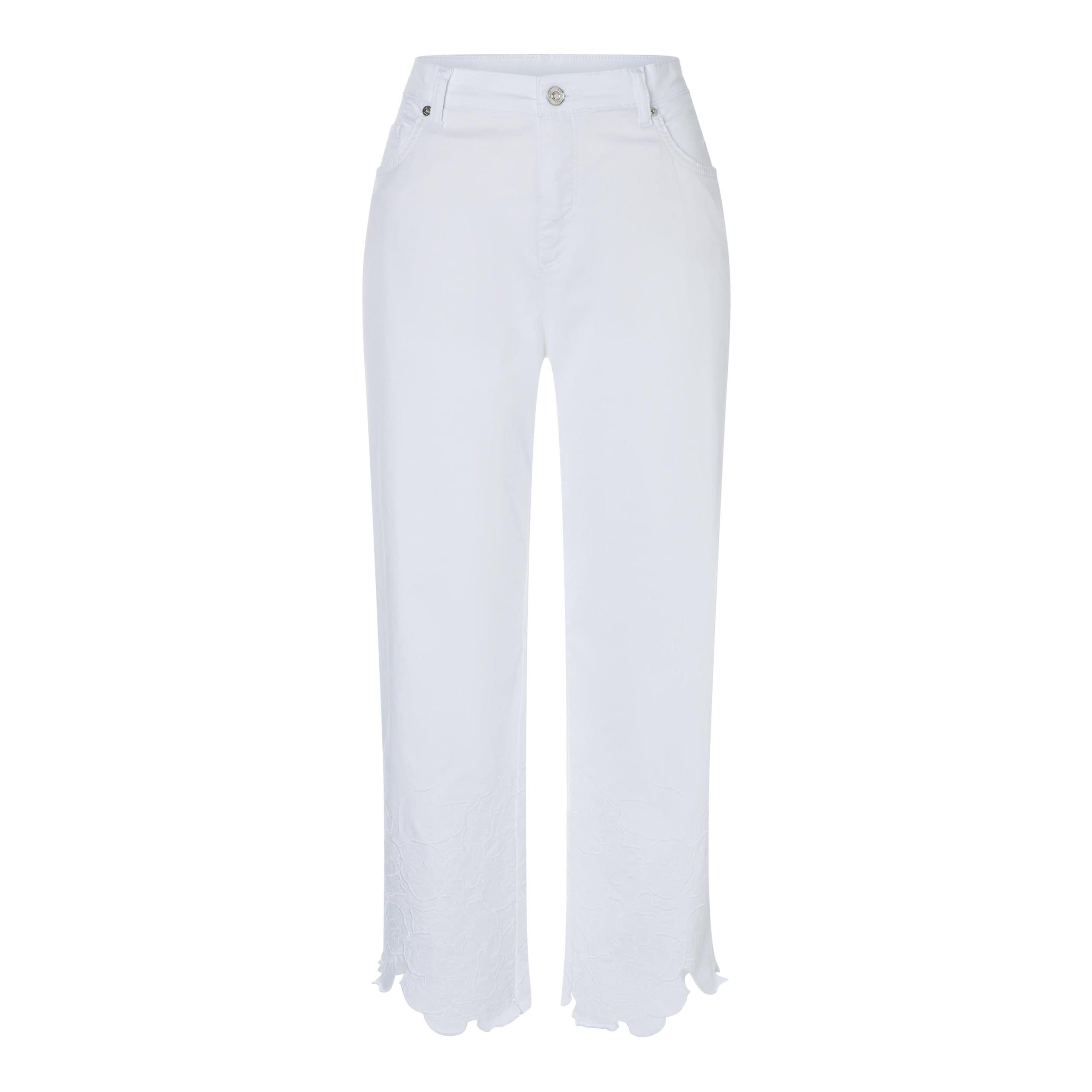 Witte pantalon van MAC, model Chiara cropped flower. Deze relaxte 7/8 pantalon is gemaakt van katoenen stretch stof (gabardine) met aan de onderzijde van de broekspijpen een bloemversiering. De losvallende broek sluit met een knoop- en ritssluting, heeft twee steekzakken, twee achterzakken, wijde, rechte broekspijpen en valt boven de enkels.
