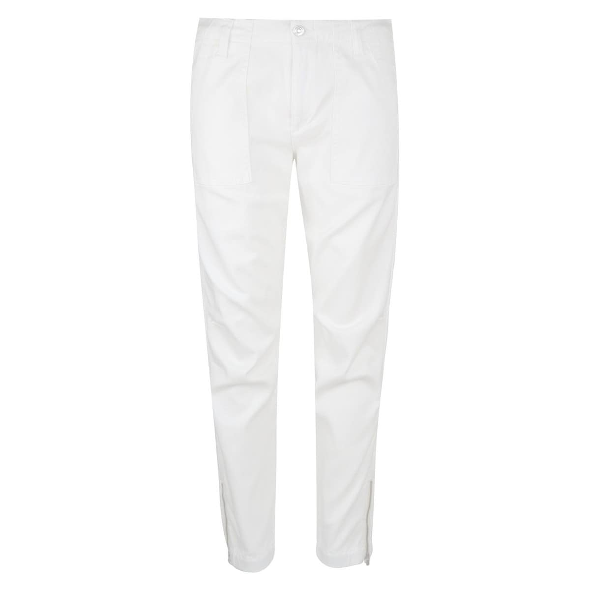 Witte worker broek van MAC, model Chino worker. Deze broek is gemaakt van een mix van lyocell en katoen, heeft een relaxte pasvorm en valt tot op de enkels. Aan de onderzijde van de broekspijpen zitten kleine ritsjes. De broek sluit met een knoop- en ritssluiting, heeft twee steekzakken aan de voorzijde en twee sier kleppen aan de achterzijde.