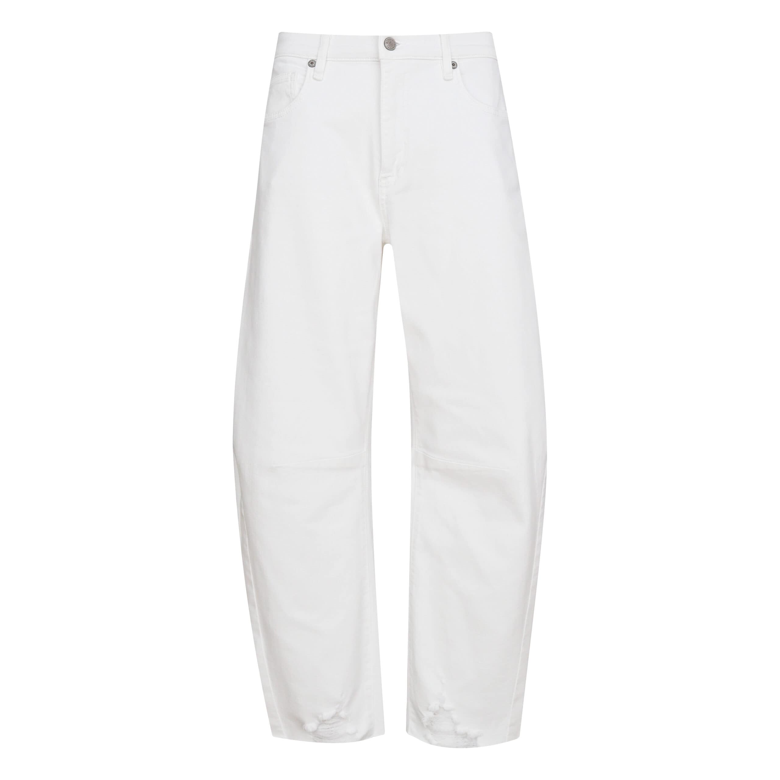 Witte jeans van MAC, model Dakota fringe, straight fit, barrel leg, highwaist. Deze los vallende broek is gemaakt van witte stretch denim met een gerafelde onderzijde en heeft een barrel pasvorm. De broek sluit met een knoopsluiting en heeft twee steekzakken aan de voorzijde en twee achterzakken.