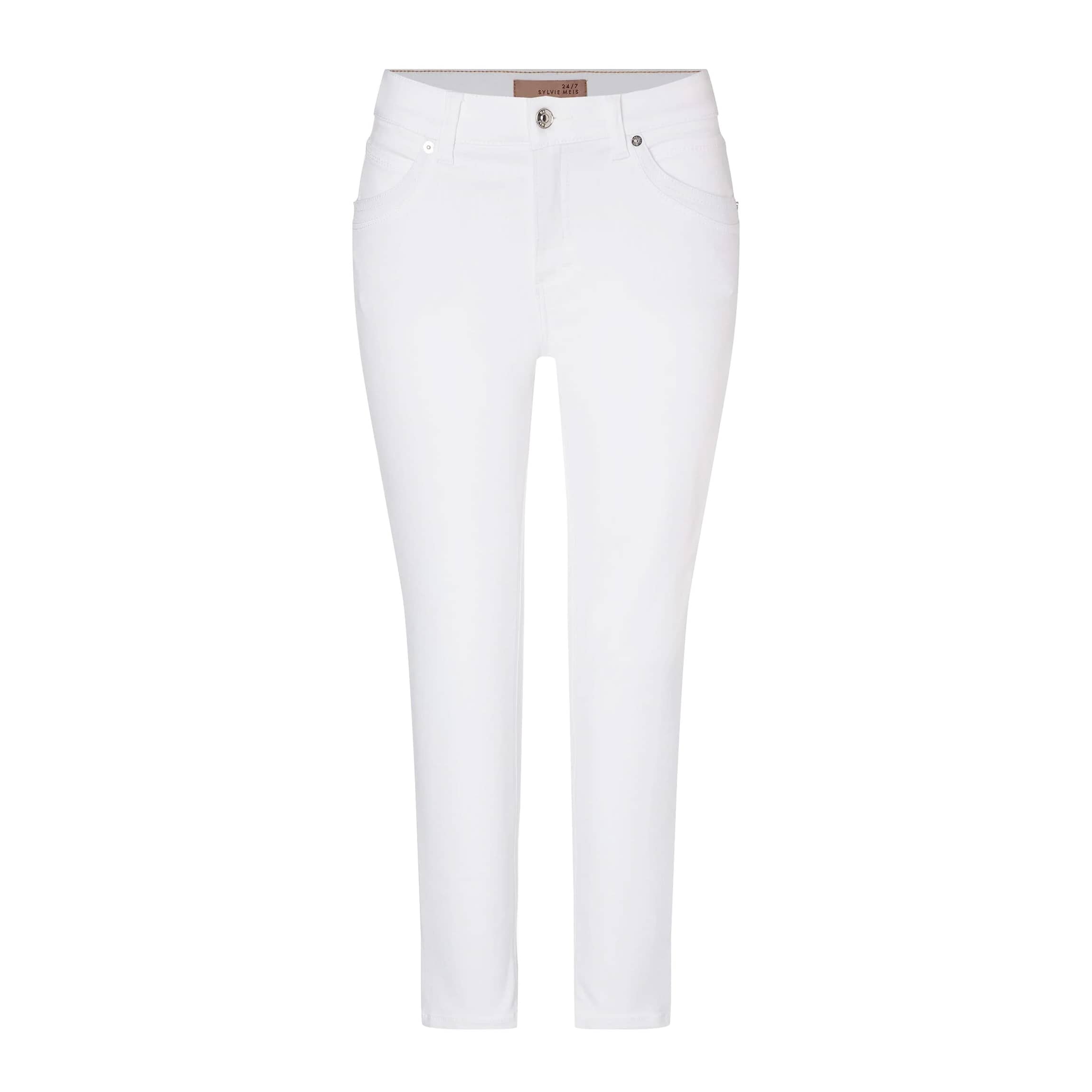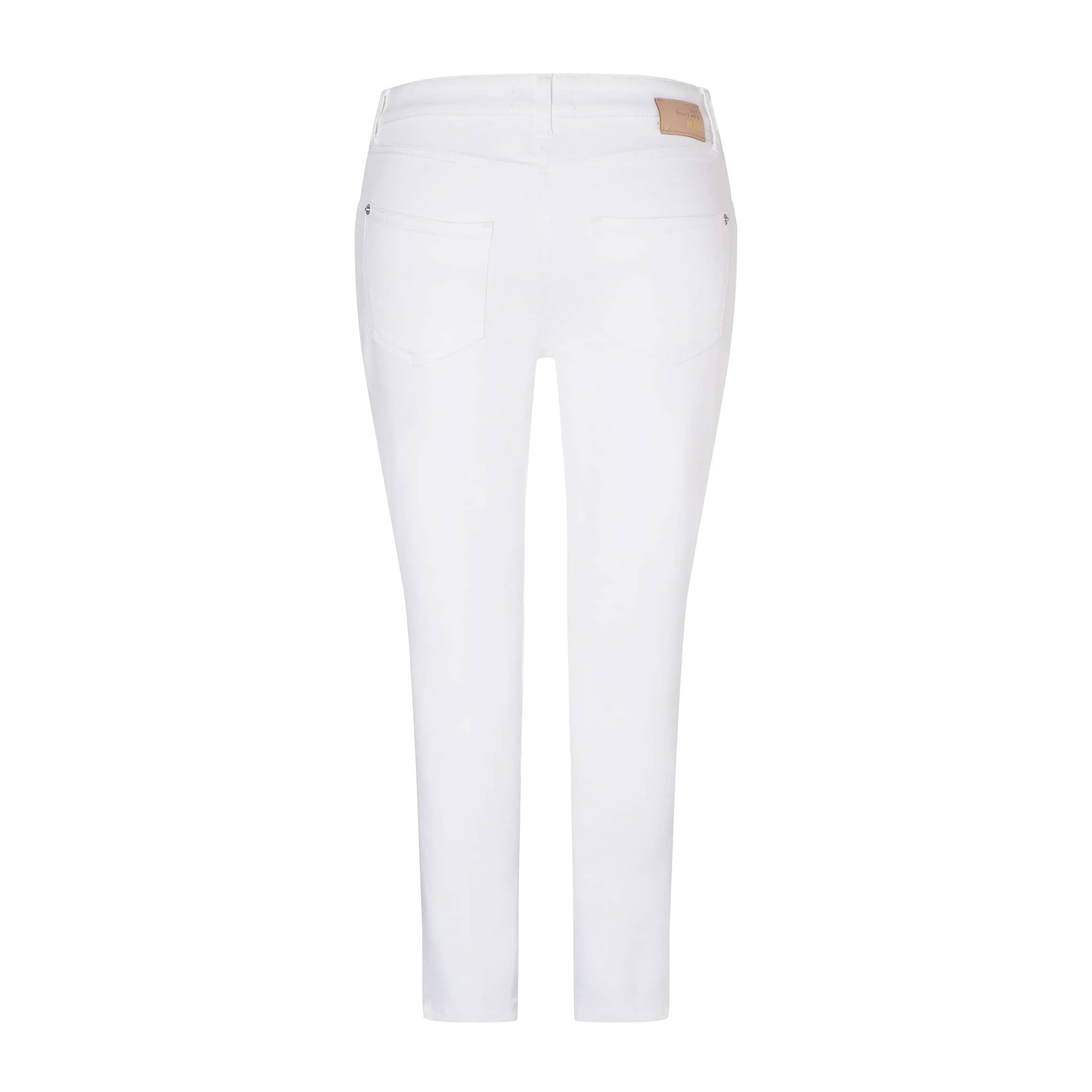 Witte jeans van MAC x Sylvie Meis, model Mel, feminine fit, slim leg. Deze denim broek is gemaakt van witte stretch denim en heeft een verhoogde smalle taille met een slim fit pasvorm. De jeans sluit met een knoop- en ritssluiting, heeft twee steekzakken en twee achterzakken.