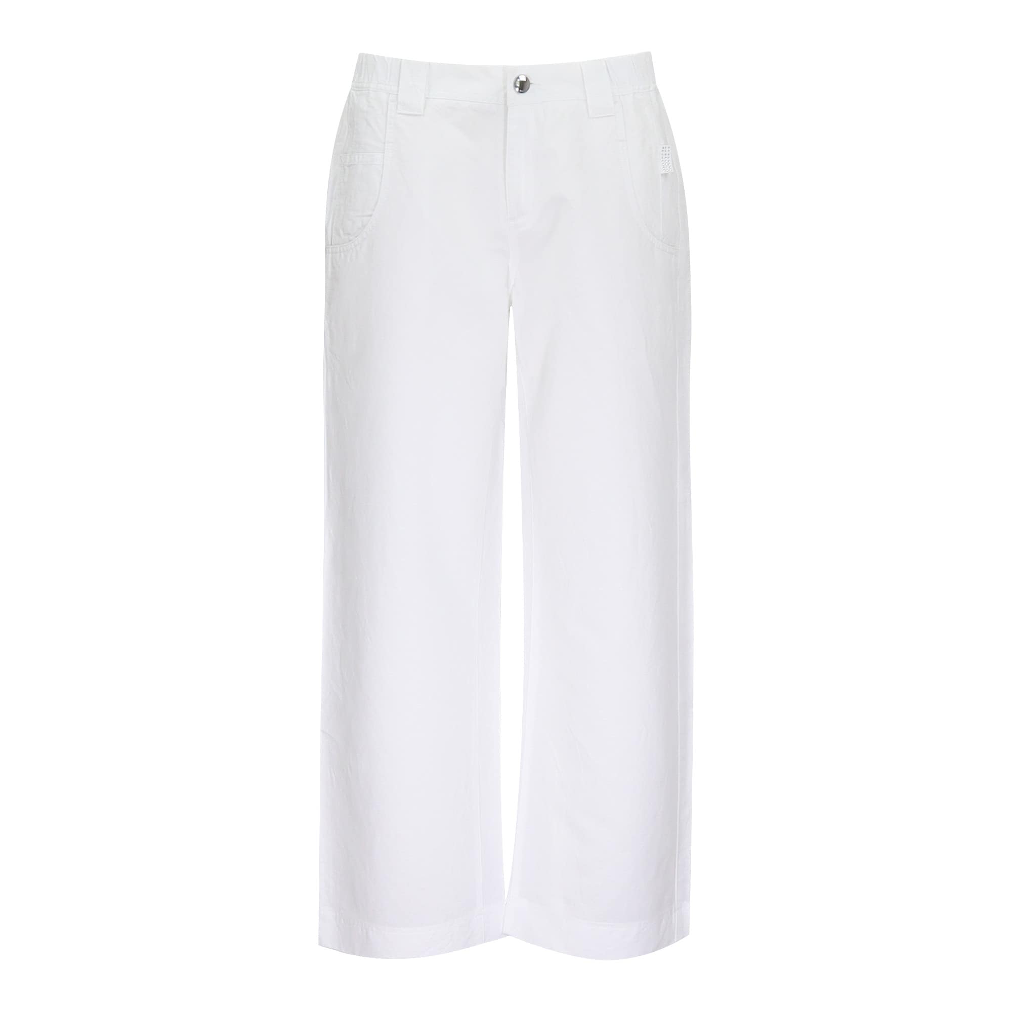 Wijde pantalon van MAC, model Noa. Deze witte broek is gemaakt van een linnen mix en heeft een normale taille, die aan de achterzijde elastische is, met wijde, rechte broekspijpen. De cropped broek sluit met een knoop- en ritssluiting en heeft twee steekzakken en twee achterzakken.