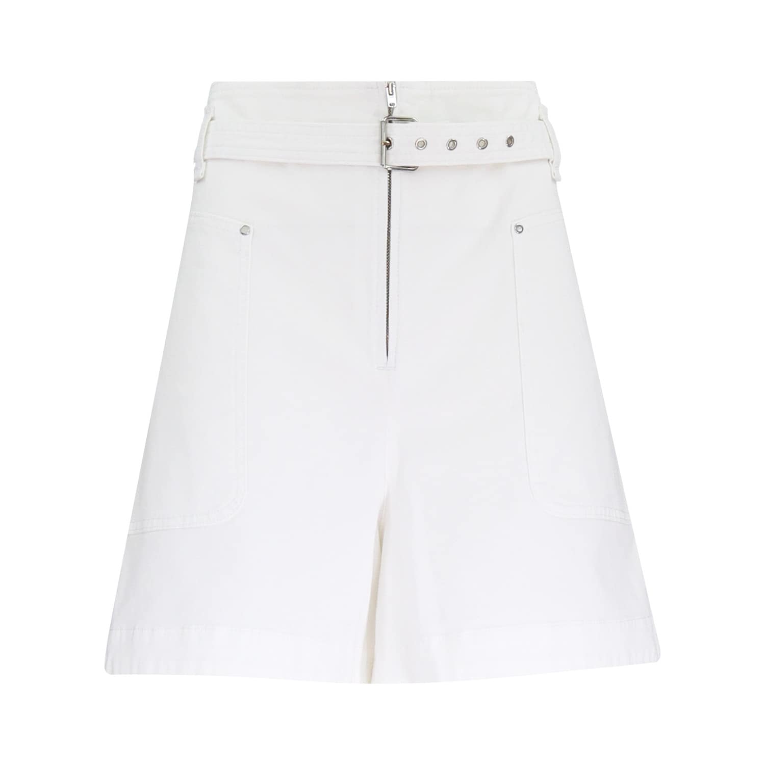Witte korte broek van MAC, model Mia. Deze short is gemaakt van stretch denim en heeft een hoge taille met ceintuur en wijde broekspijpen. De korte broek sluit met een ritssluiting, heeft twee steekzakken, twee achterzakken en een losse pasvorm.