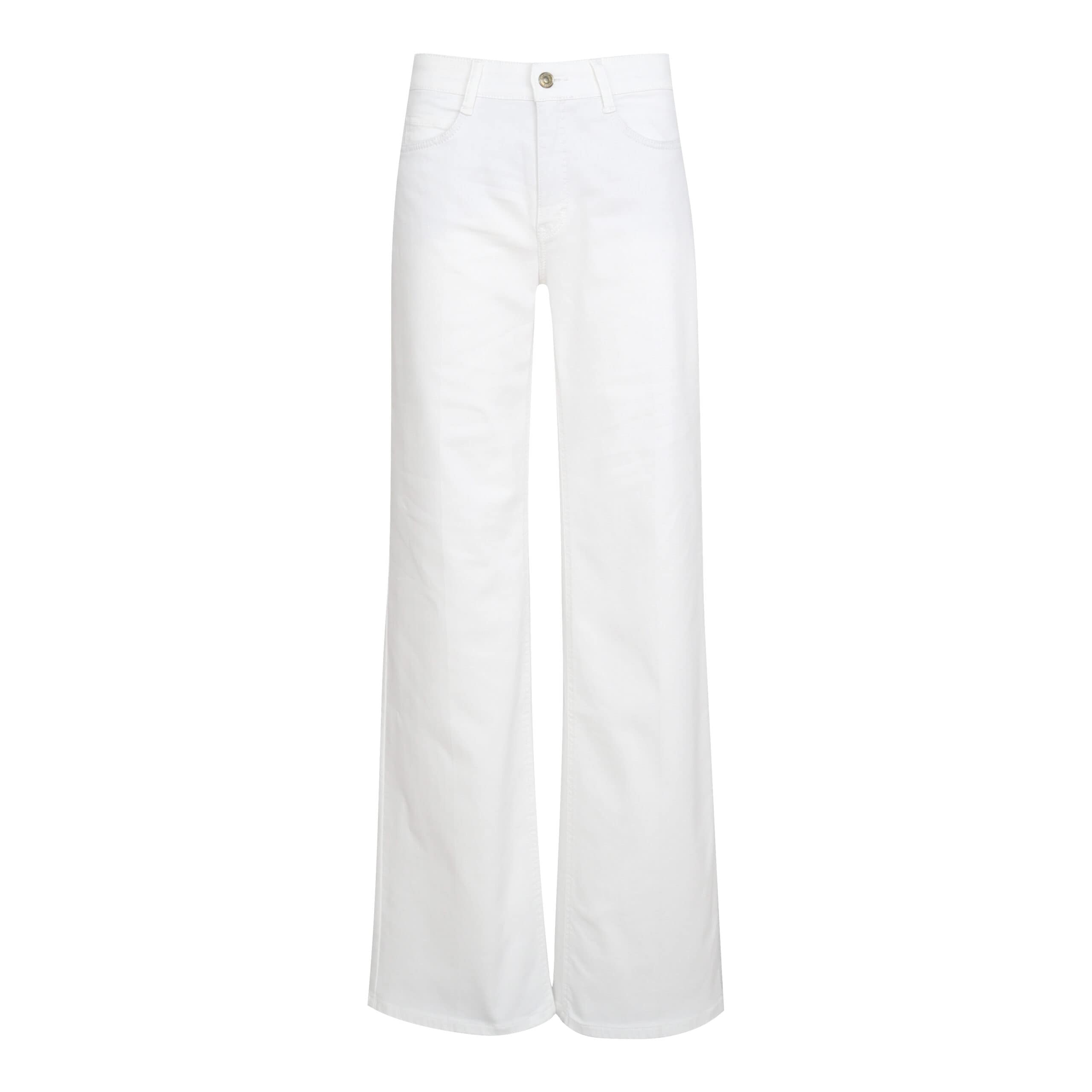 Witte jeans van MAC, model Wide, straight fit, wide leg in white. Deze broek is gemaakt van stretch denim, heeft een hoge taille en wijde, rechte broekspijpen. De jeans sluit met een knoop- en ritssluiting, heeft twee steekzakken en twee achterzakken.