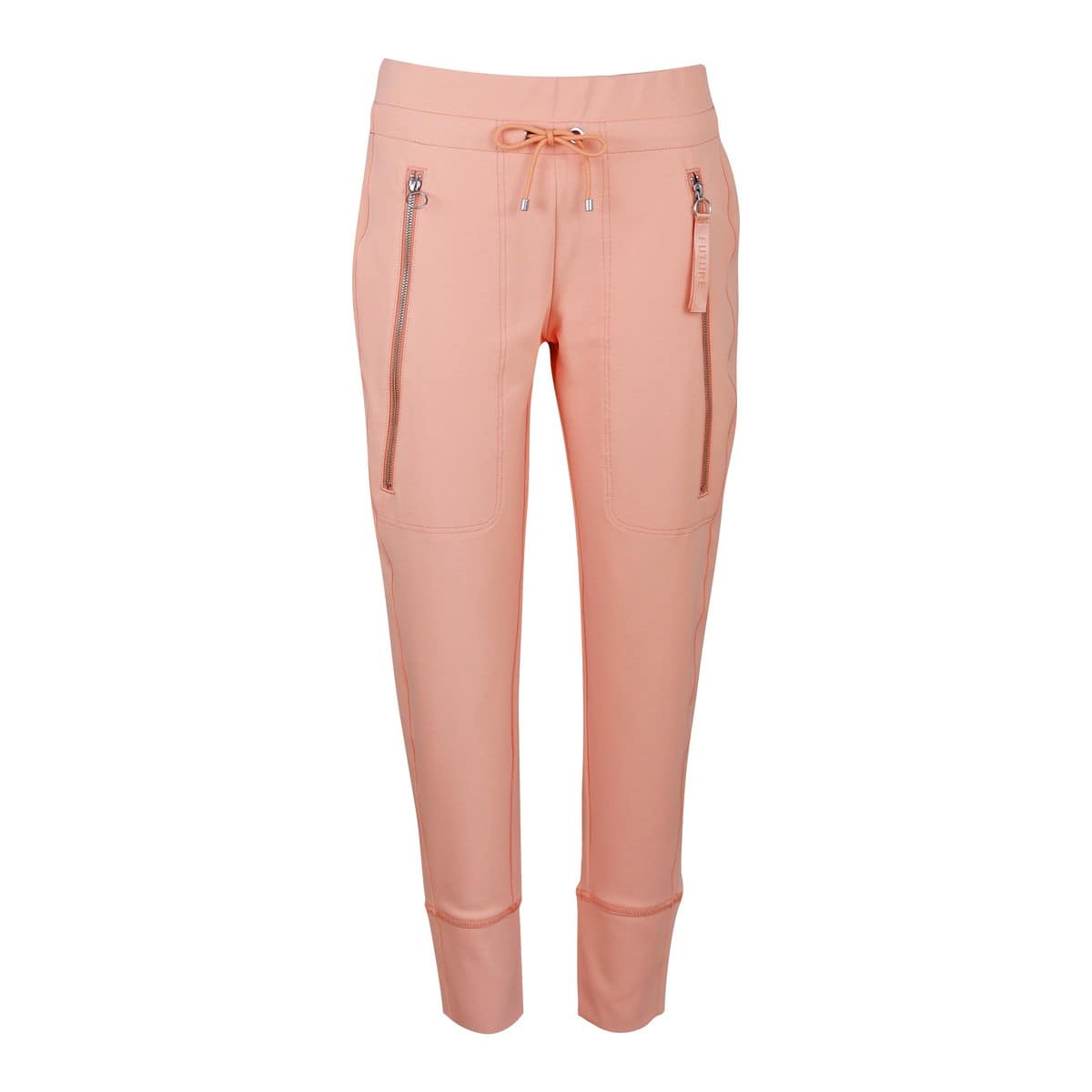 Relaxte pantalon van MAC Jeans, model Future 3.0 in zalmroze. Deze effen broek heeft taps toelopende broekspijpen met twee zakken achter ritsjes aan de voorzijde. De broek is gemaakt van een soepelvallende zalmroze stof en heeft een tailleband met trekkoord.