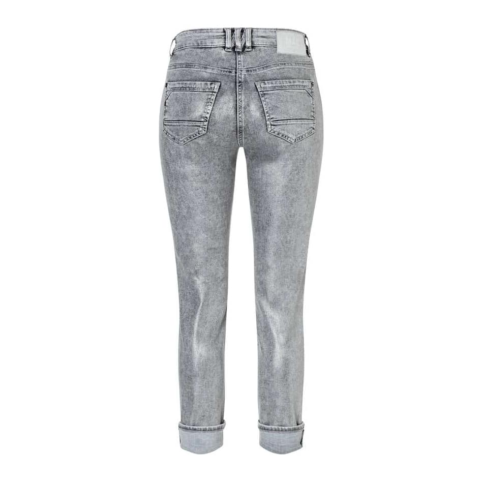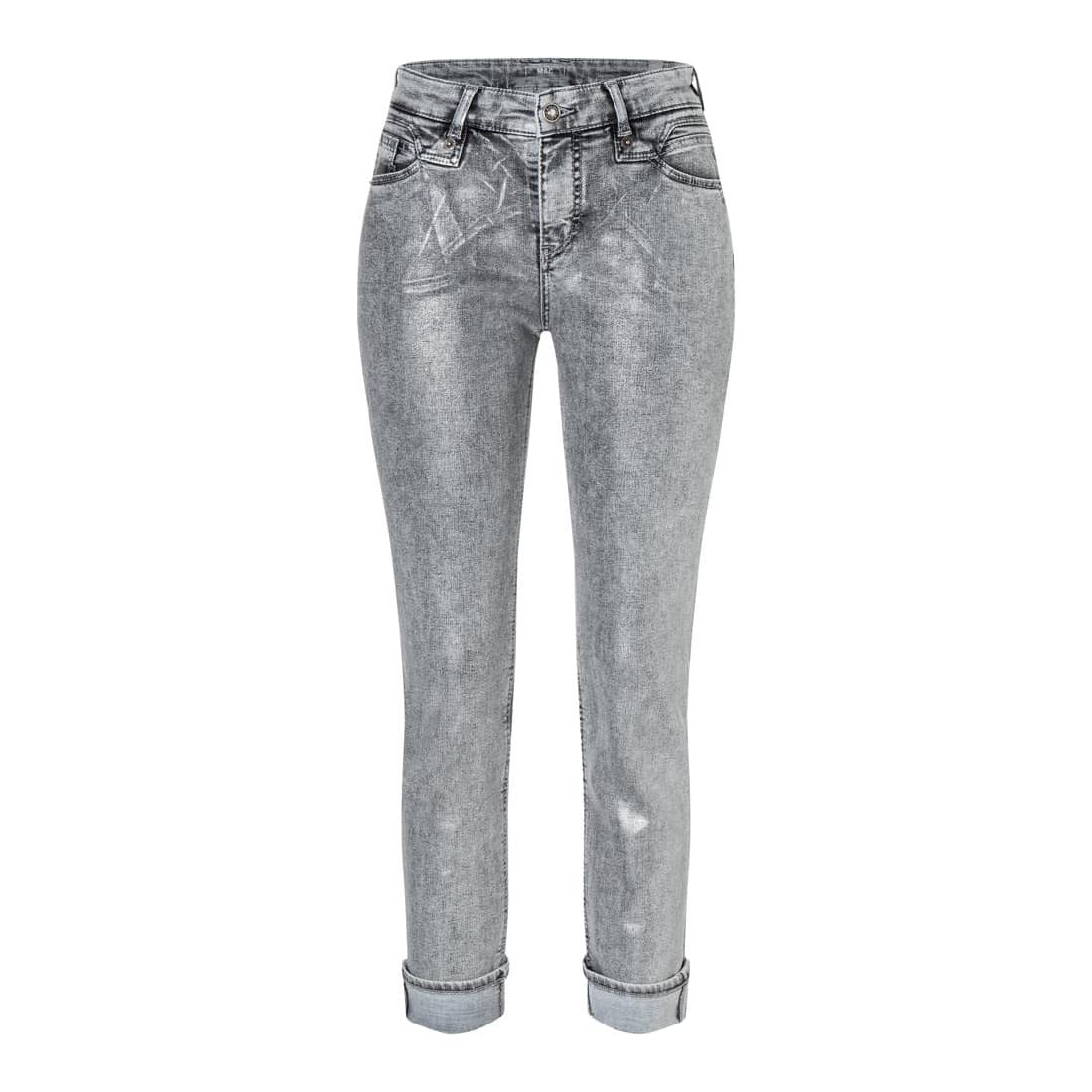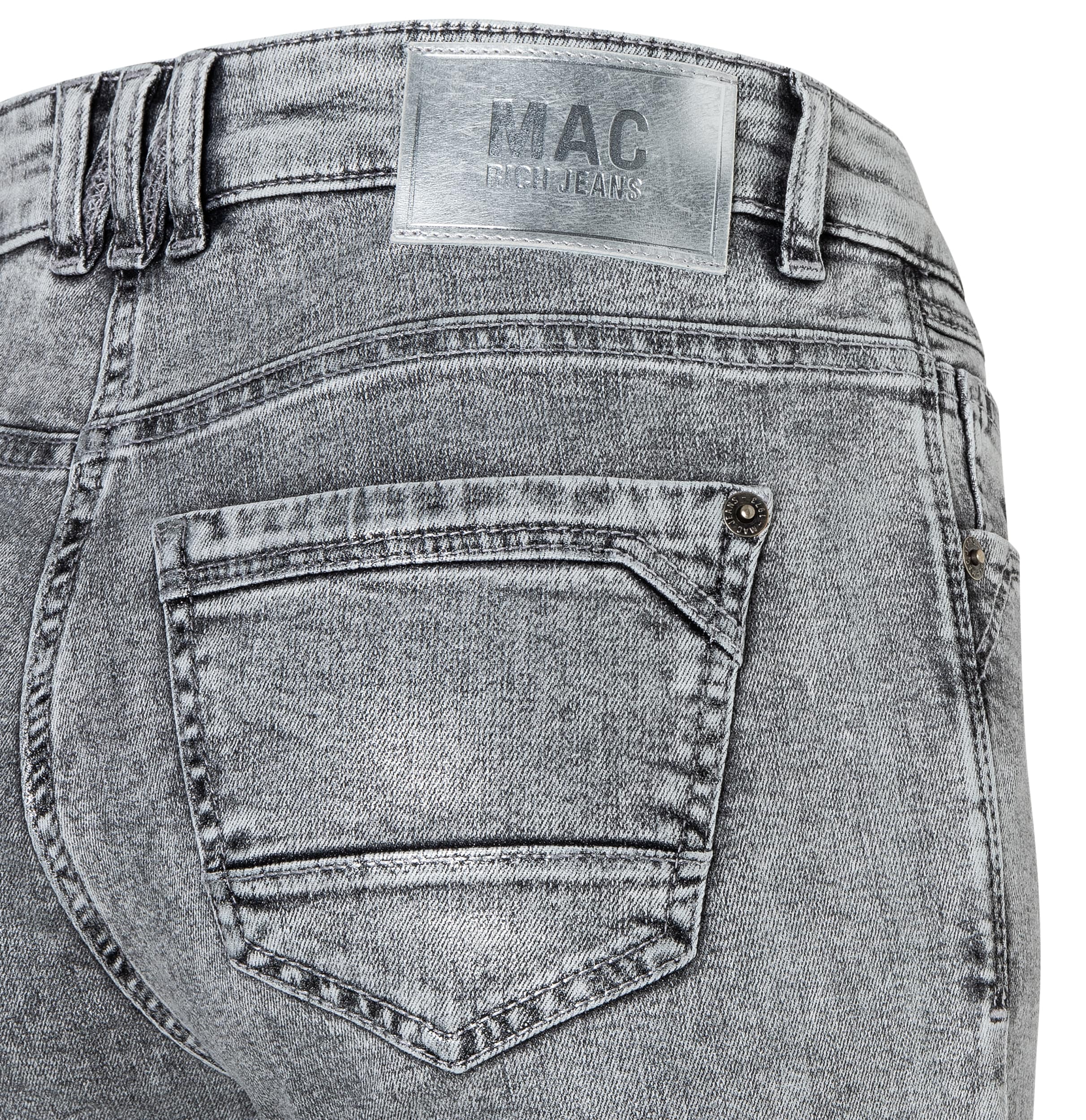 Slim fit jeans van MAC, model Rich Slim, straight fit, slim leg in silver grey coated. Deze broek is gemaakt van grijze stretch denim met een zilveren coating, heeft een normale taille, slim fit pasvorm met toelopende broekspijpen. De broek sluit met een knoop- en ritssluiting, heeft twee steekzakken en twee achterzakken.