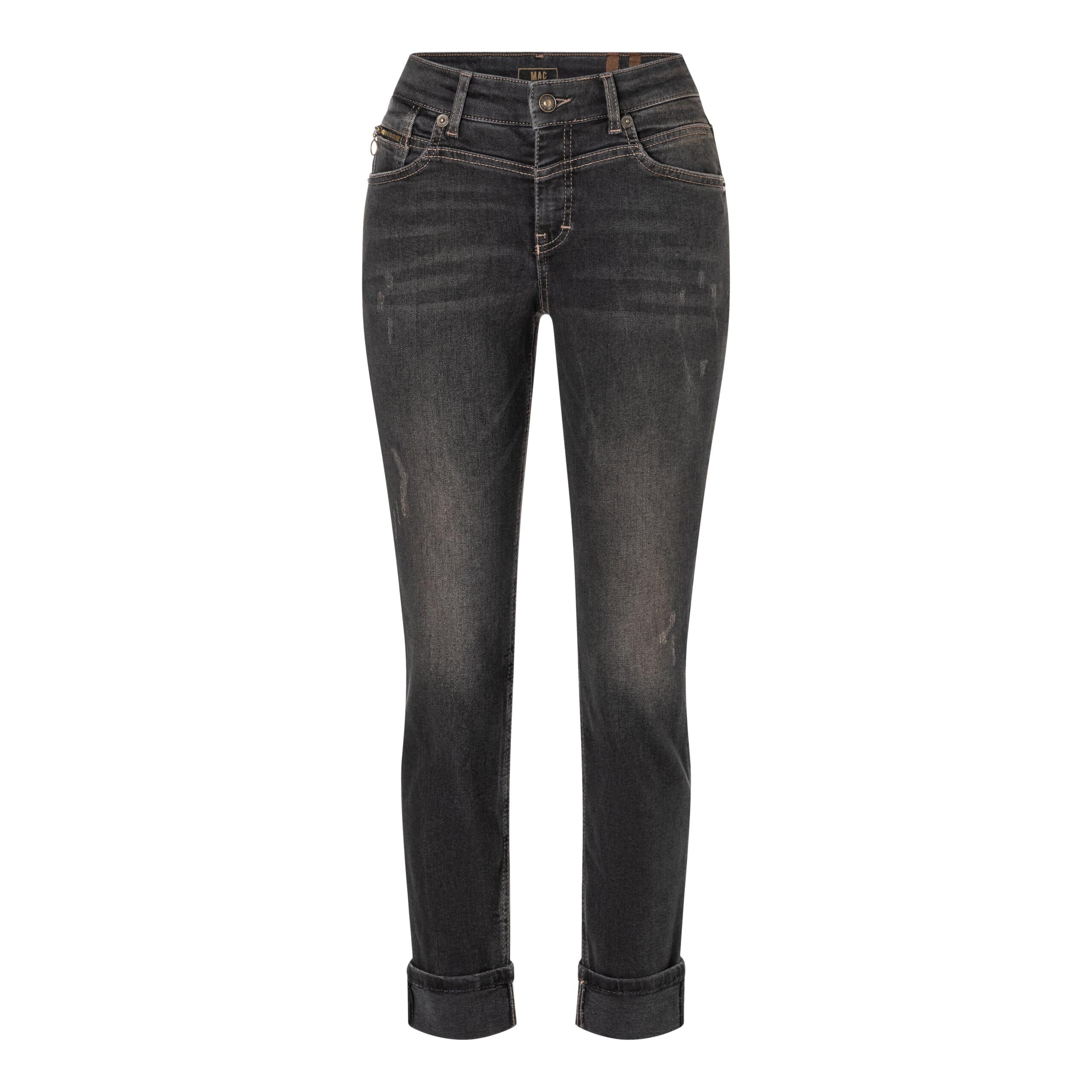 Zwarte jeans met bruine wassing van MAC, model Rich Slim, slim fit, slim leg in fancy brown black. Deze 7/8 jeans heeft een slim fit pasvorm met twee steekzakken en twee achterzakken. De broek sluit met een knoop- en ritssluiting, is gemaakt van zwarte denim stretch stof met een bruine wassing en heeft lichte beschadigingen.