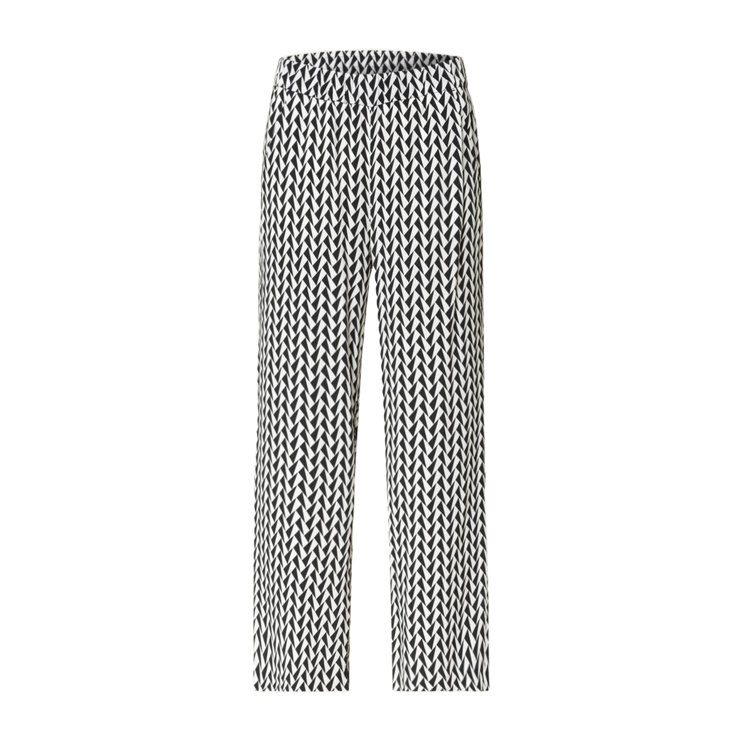Zwart witte broek van MAC, model Chiara cropped. Deze relaxte 7/8 pantalon heeft wijde rechte broekspijpen met een zwart witte driehoekjes print. De losvallende broek heeft een elastische taille en twee steekzakken.