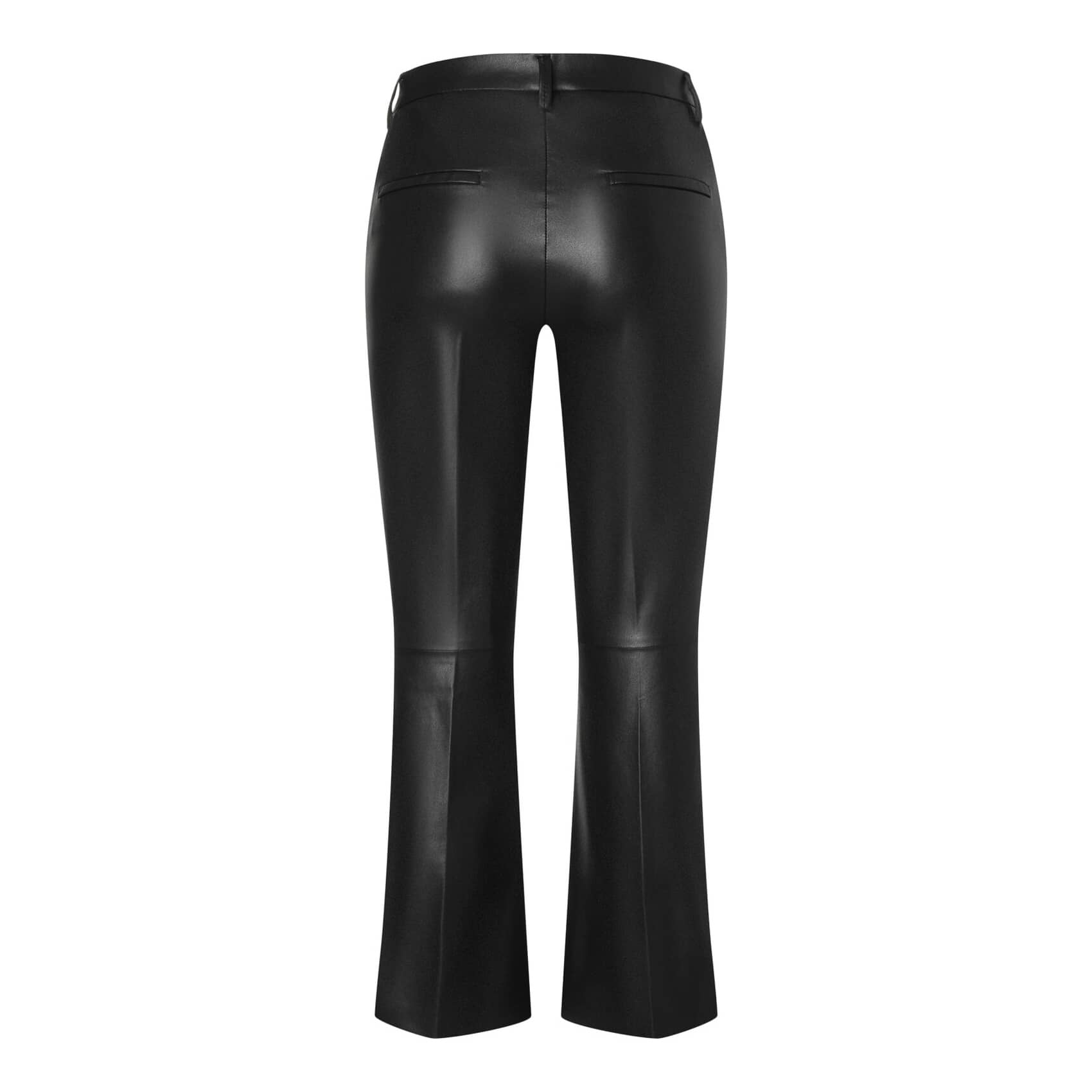 Zwarte pantalon van MAC, model Aida Boot vegan in light vegan leather. Deze broek heeft een normale taille, twee steekzakken aan de voorzijde, twee sier paspelzakjes aan de achterzijde en sluit met een knoop- en ritssluiting. De pantalon is gemaakt van een gladde effen zwarte leerlook stof en heeft flared broekspijpen.