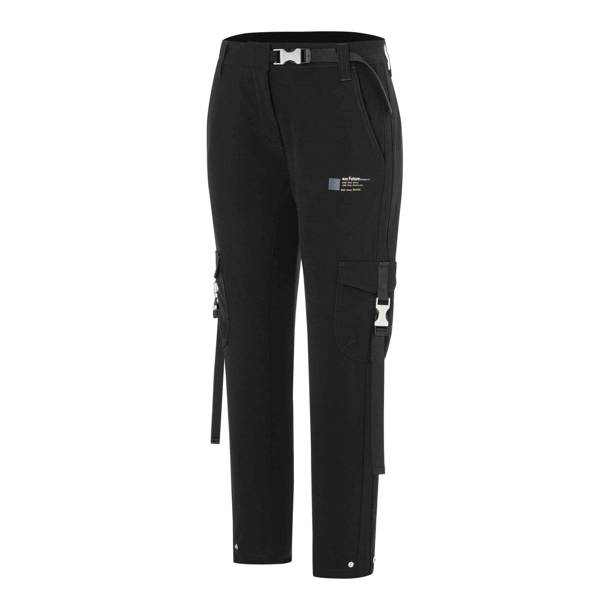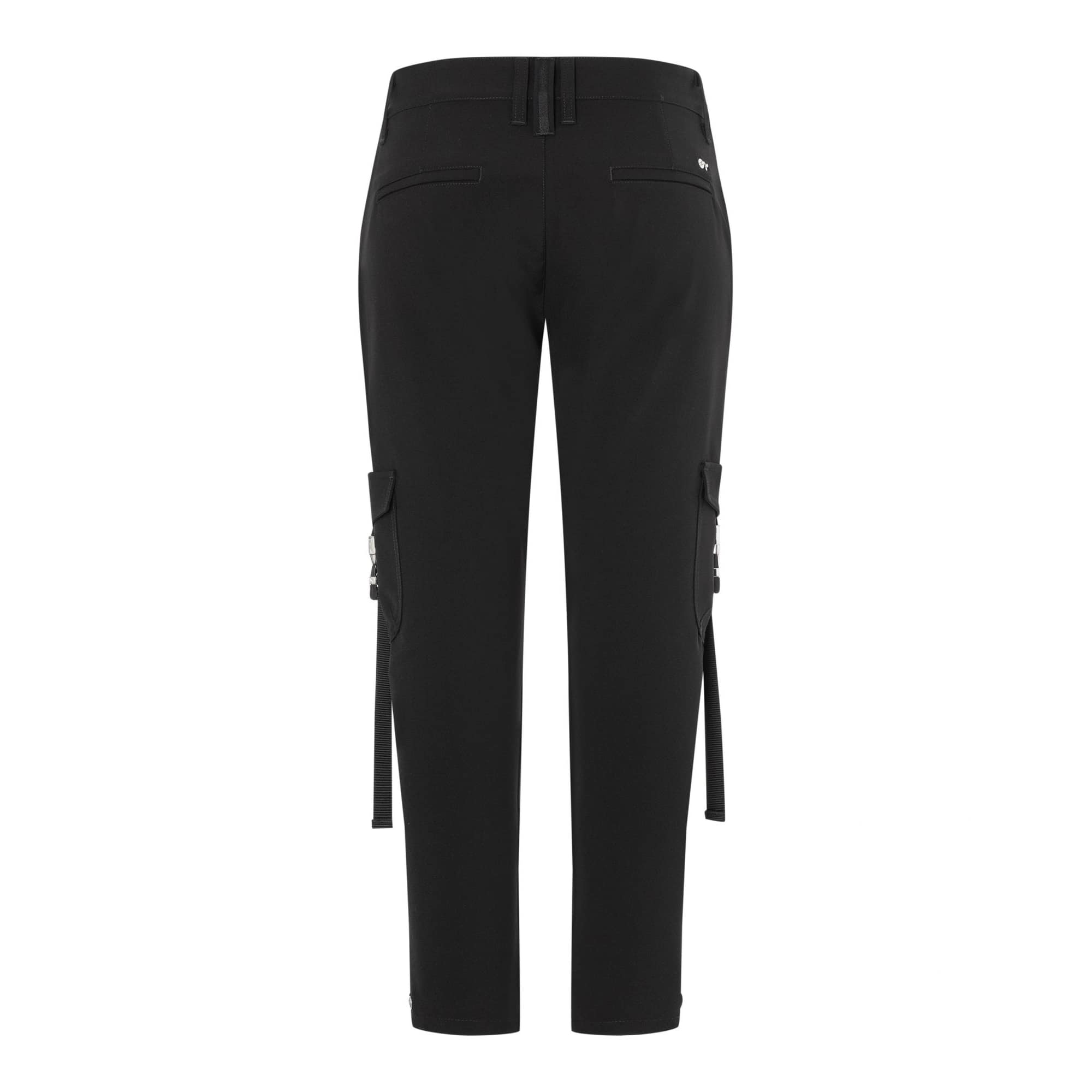 Relaxte pantalon van MAC Jeans, model Traveller. Deze broek heeft toelopende broekspijpen met twee cargo zakken die sluiten met een gesp. De broek is gemaakt van een soepel vallende zwarte bistretch stof, heeft twee steekzakken en sluit met een gesp, knoop- en ritssluiting.