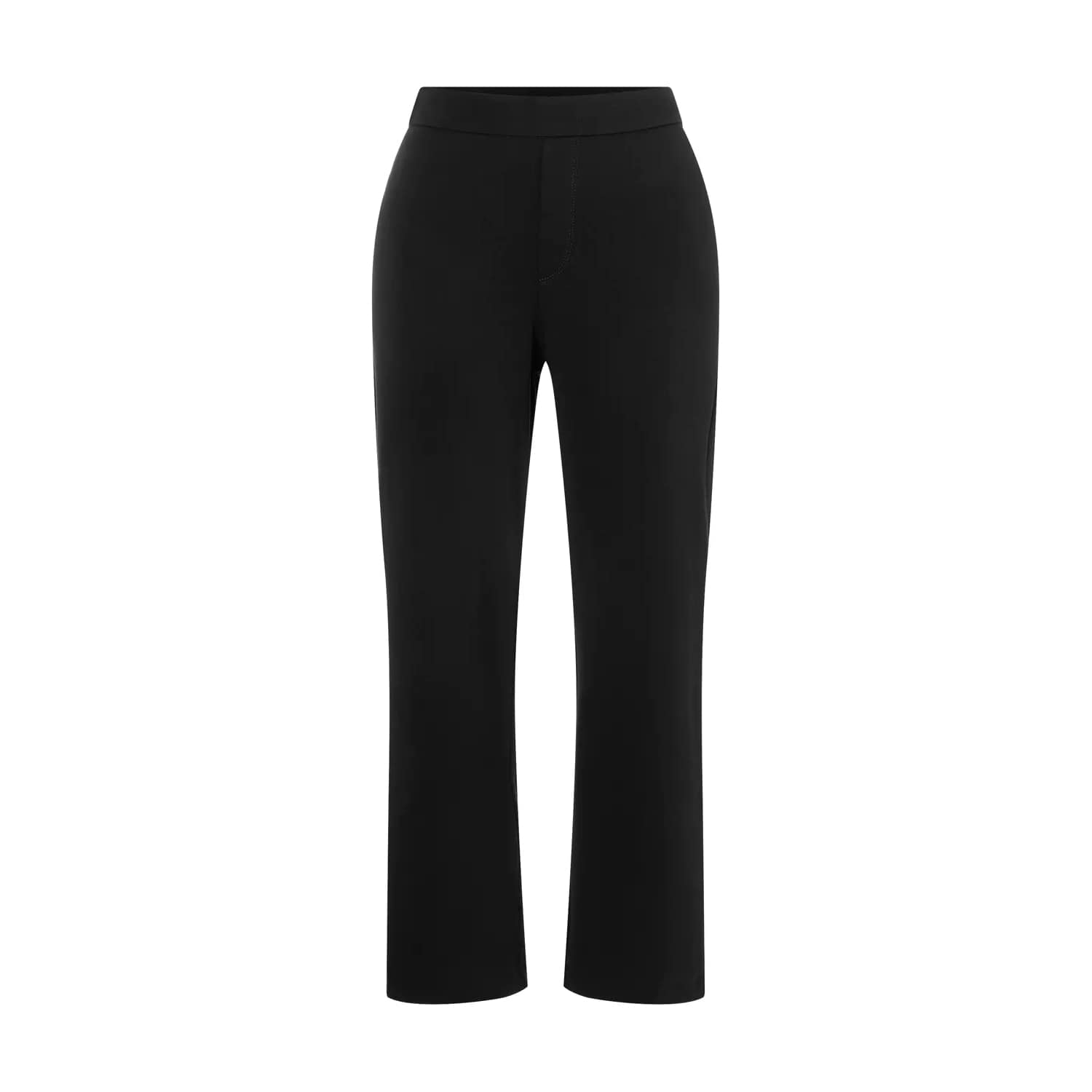 Zwarte pantalon van MAC, model Chiara. Deze relaxte pantalon is gemaakt van een zwarte crêpe stof en heeft wijde rechte broekspijpen met aan beide zijkanten een bies. De losvallende 7/8 broek heeft een elastische taille en twee steekzakken.