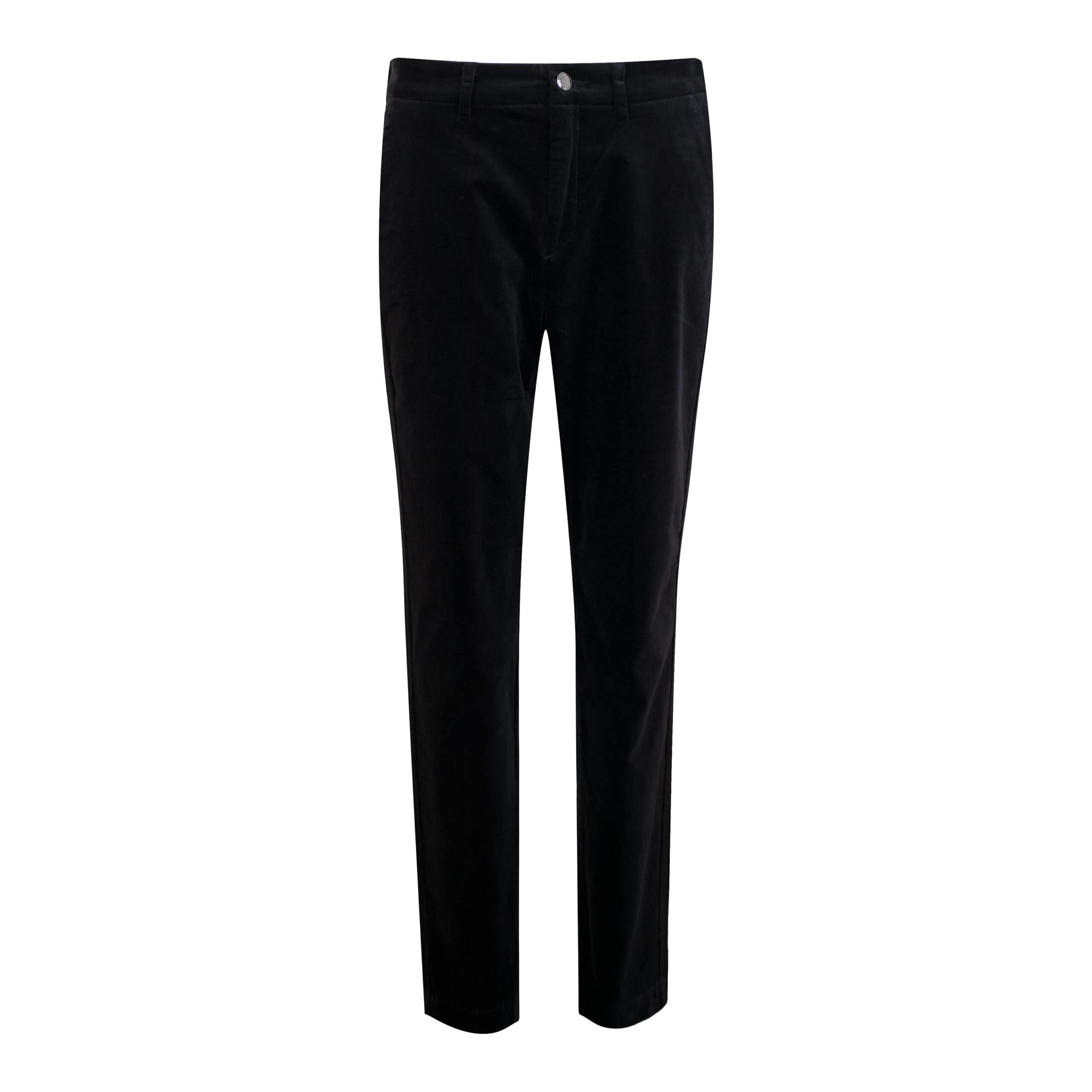 Zwarte chino van MAC, model Chino velvet. Deze pantalon is gemaakt van een fluwelen stretch stof en heeft een slim fit pasvorm. De fluwelen broek sluit met een knoop- en ritssluiting, heeft twee steekzakken aan de voorzijde en twee sier paspelzakjes.