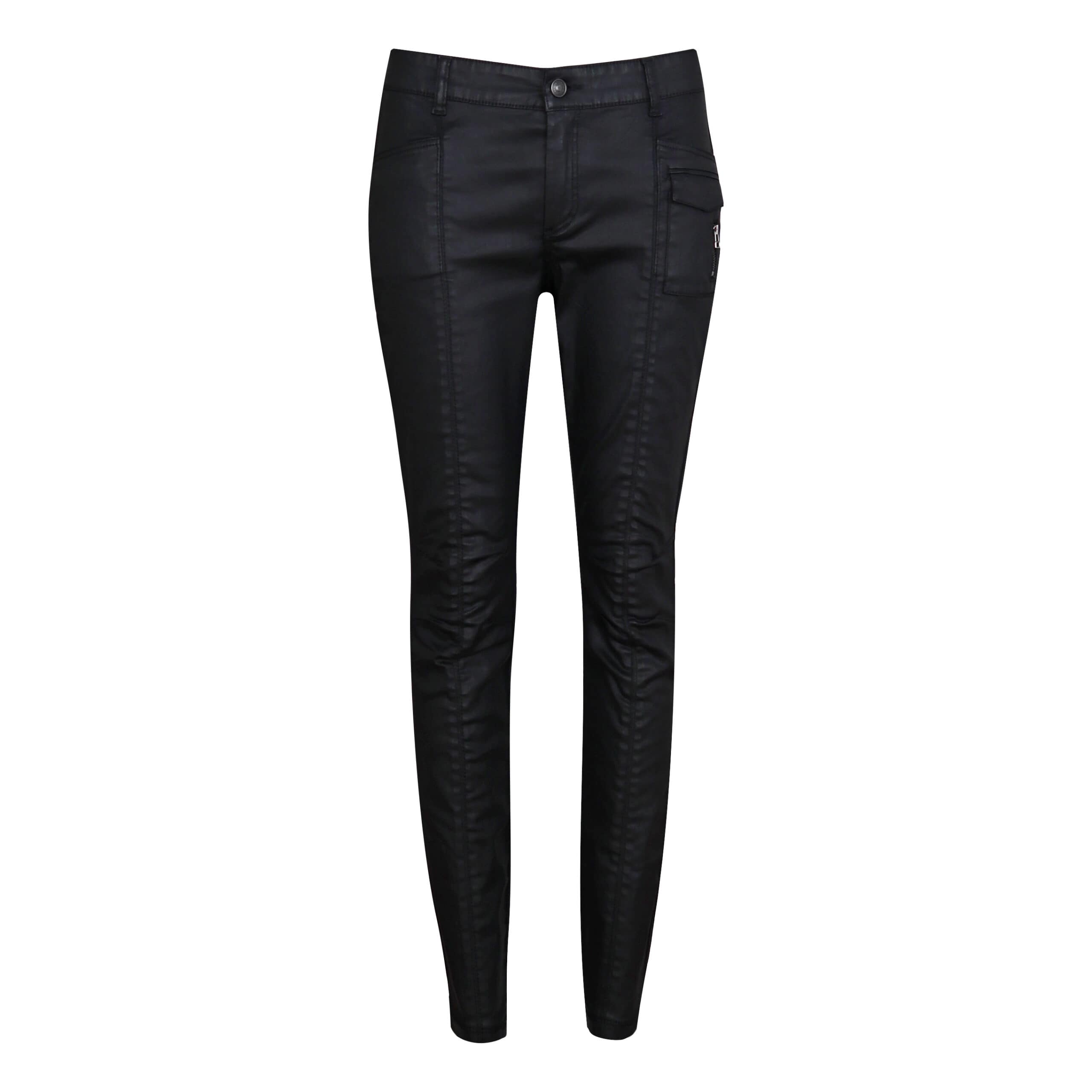 Coated jeans van MAC, model Biker 2.0, straight fit, skinny leg. Deze broek is gemaakt van coated stretch stof, heeft een normale taille en een skinny pasvorm. De jeans sluit met een knoop- en ritssluiting, heeft twee rechte steekzakken met aan een zijde een klepje en decoratief ritsje en twee sier klepzakken.