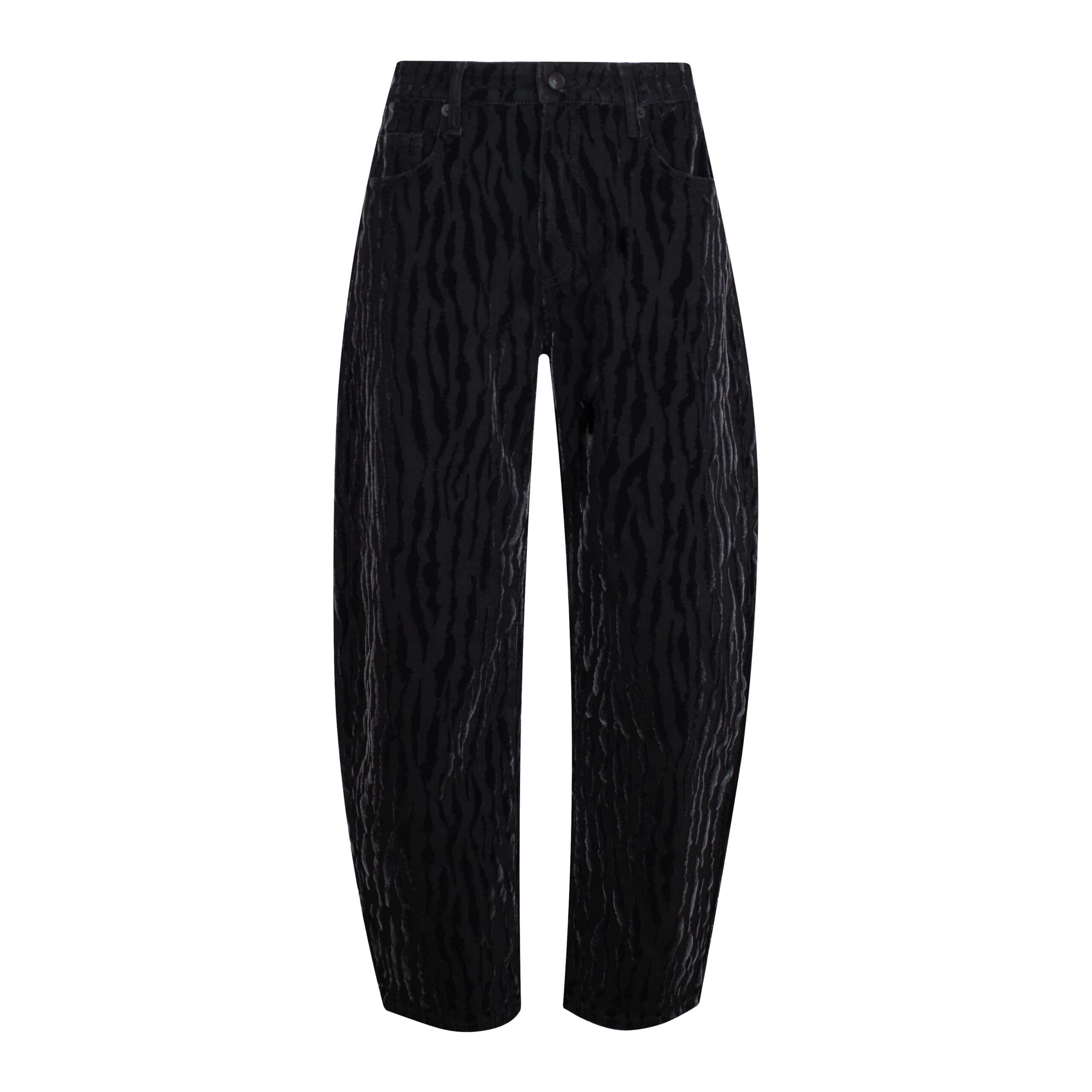 Zwarte jeans van MAC, model Danni, loose fit, barrel leg. Deze los vallende broek is gemaakt van zwarte stretch denim met een zwarte fluwelen dieren print, heeft een hoge taille en een barrel broekspijpen. De broek sluit met een knoop- en ritssluiting, heeft twee steekzakken aan de voorzijde en twee achterzakken.
