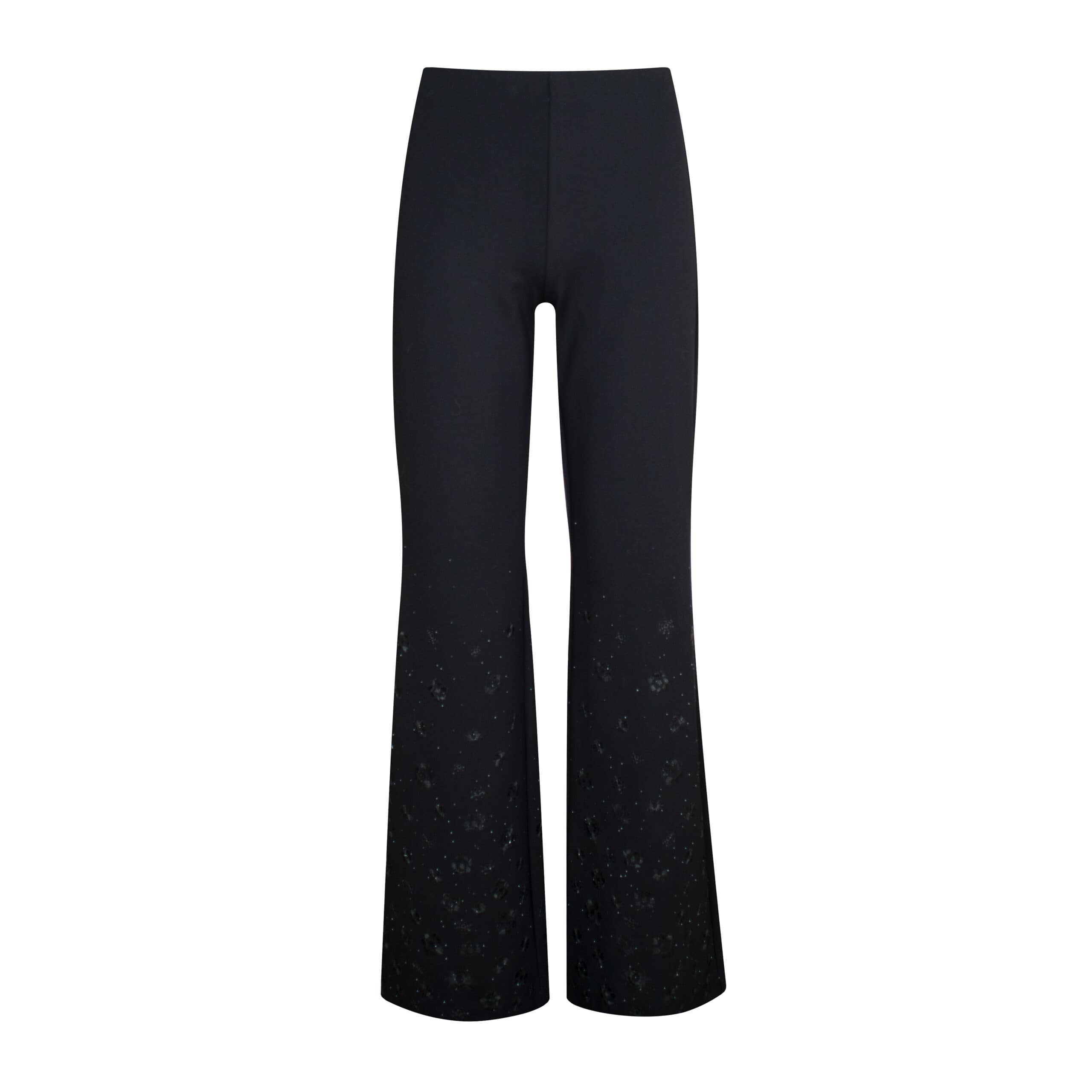 Flared pantalon van MAC, model Flare galaxy. Deze broek is gemaakt van zwarte jersey stretch stof met uitlopende broekspijpen die aan de onderzijde bezet zijn met kleine strass steentjes en borduursel. De pantalon heeft een iets hogere taille en een elastische tailleband.