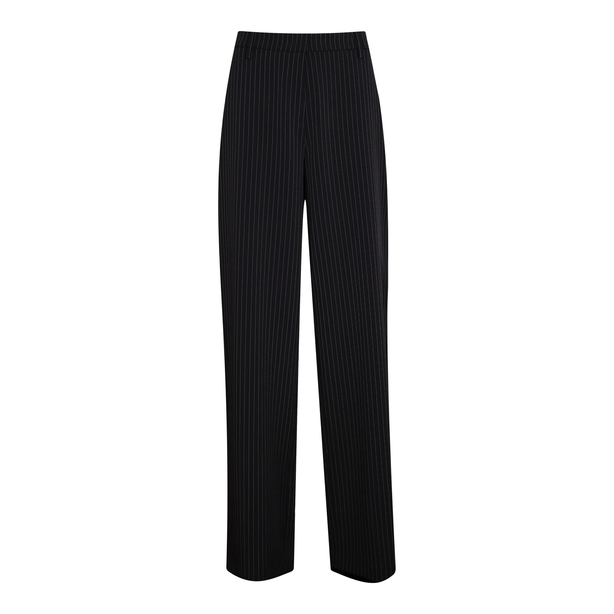 Wijde, rechte pantalon van MAC, model Camilla. Deze broek is gemaakt van een zwarte, gladde stretch stof met een witte krijtstreep. De pantalon sluit met haakjes, knoop- en ritssluiting, de taille is aan de achterzijde elastisch en wijde, rechte broekspijpen.
