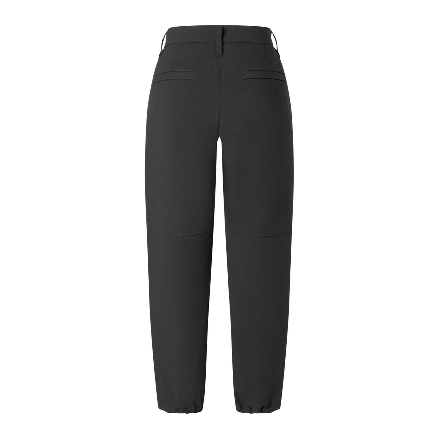 Relaxte pantalon van MAC, model Olivia. Deze broek is gemaakt van een zwarte stretch stof, heeft een geplooide taille en losvallende toelopende broekspijpen met een elastische zoom en ritsjes. De broek sluit met een haakje, knoop- en ritssluiting, heeft twee steekzakken en twee sier paspelzakken.