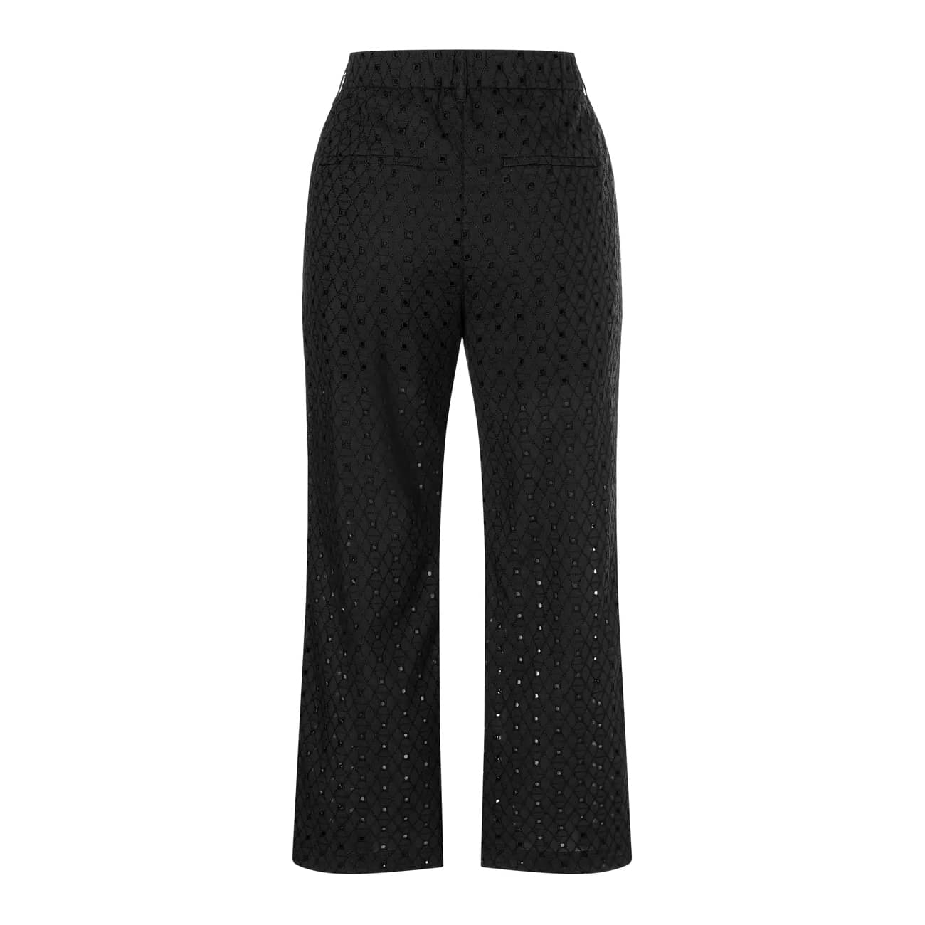 Zwarte embroidery broek van MAC, model Cari in black. Deze pantalon is gemaakt van een zwarte katoenen stof die opgewerkt en geborduurd is. De broek heeft rechte broekspijpen met twee steekzakken en sier paspelzakken aan de achterzijde, sluit met een knoop- en ritssluiting en valt boven de enkels.