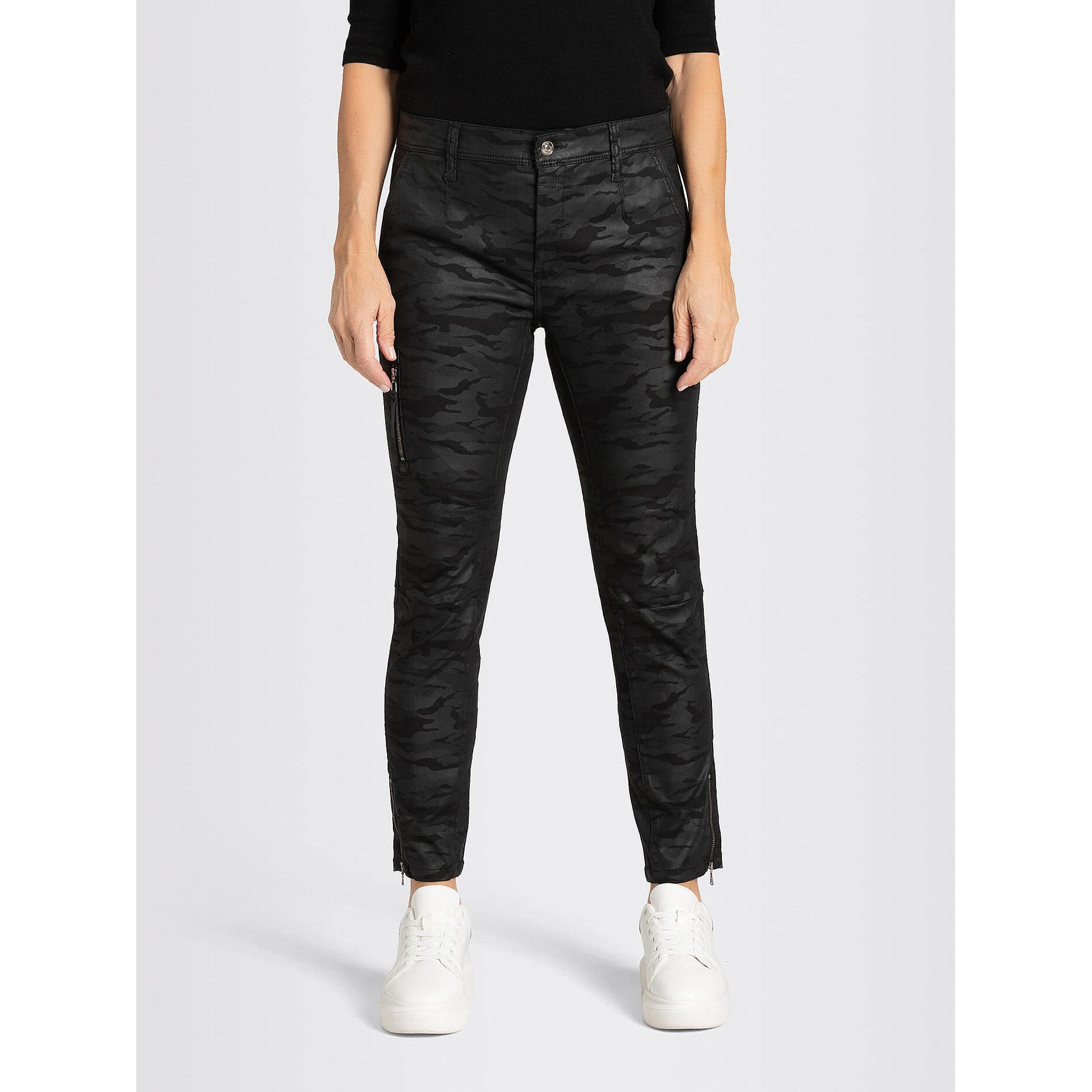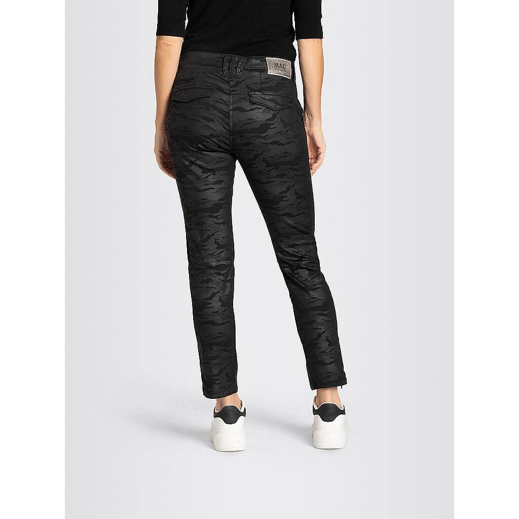 Relaxte pantalon van MAC Jeans, model Rich cargo coating, relaxed slim fit, slim leg. Deze zwarte broek is gemaakt van een stretch katoen mix met een zwarte camouflage coating, heeft een normale taille, relaxed fit met toelopende broekspijpen. De jeans sluit met een knoop- en ritssluiting, heeft twee steekzakken en sier kleppen op de achterzijde. Aan de onderzijde van de broekspijpen zitten ritsjes.