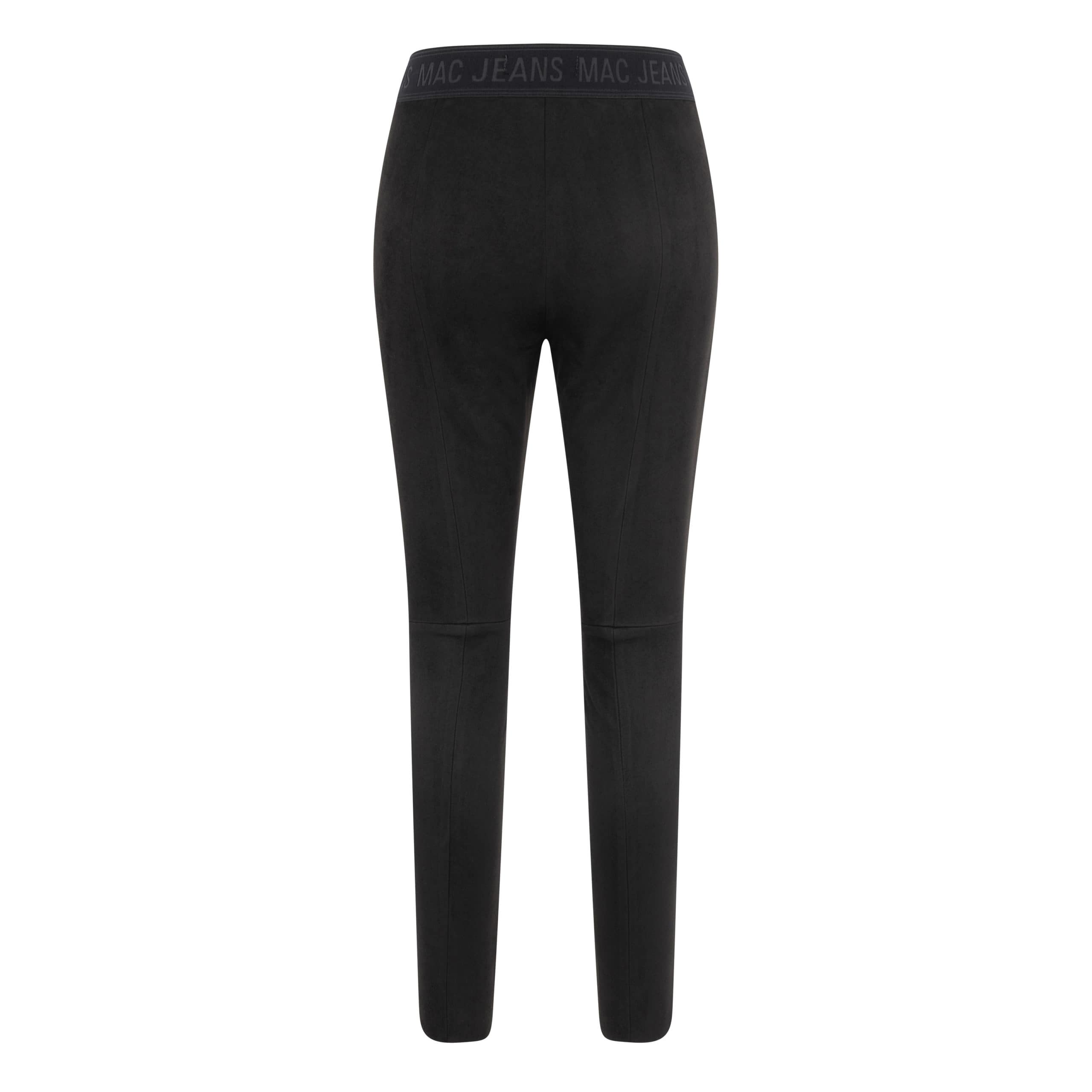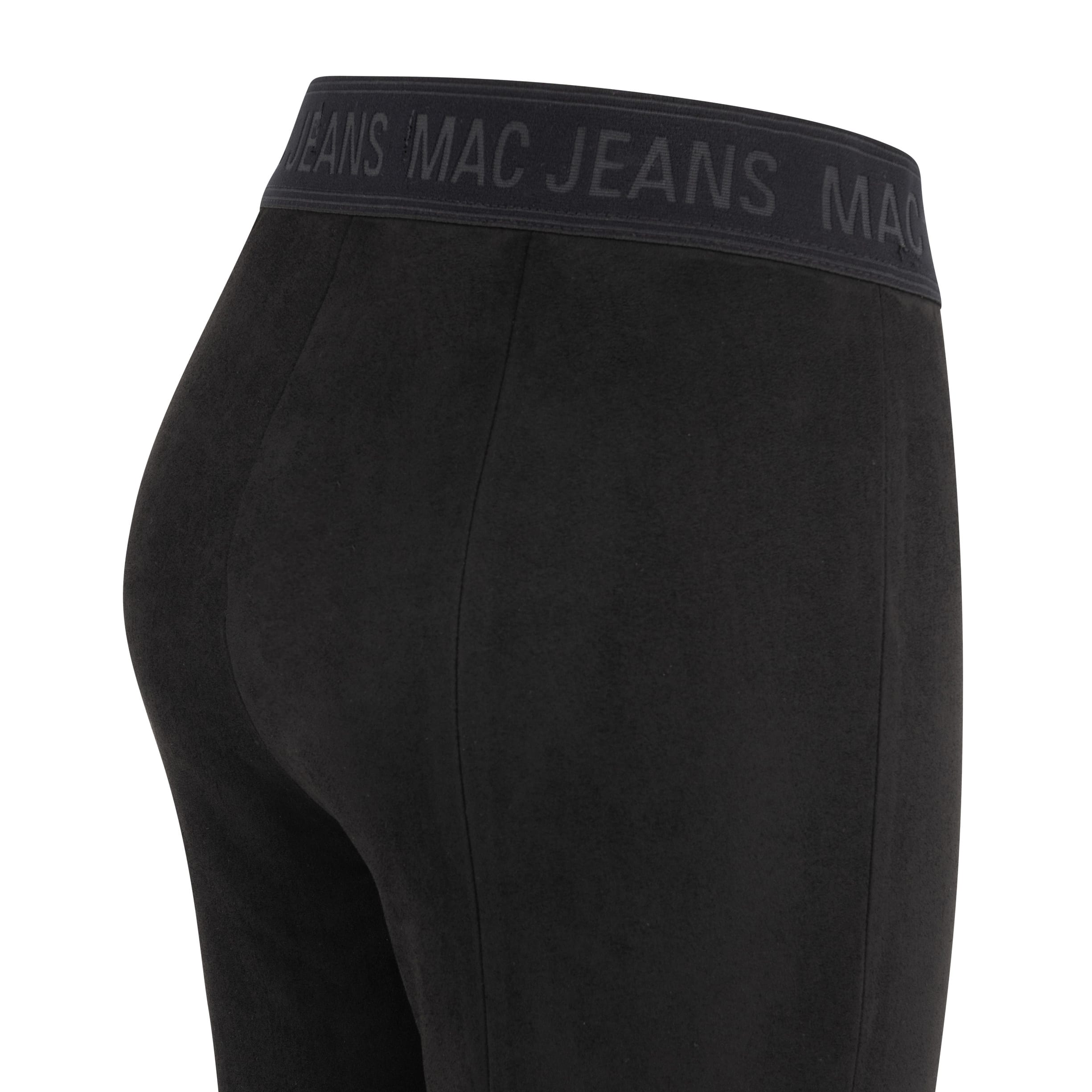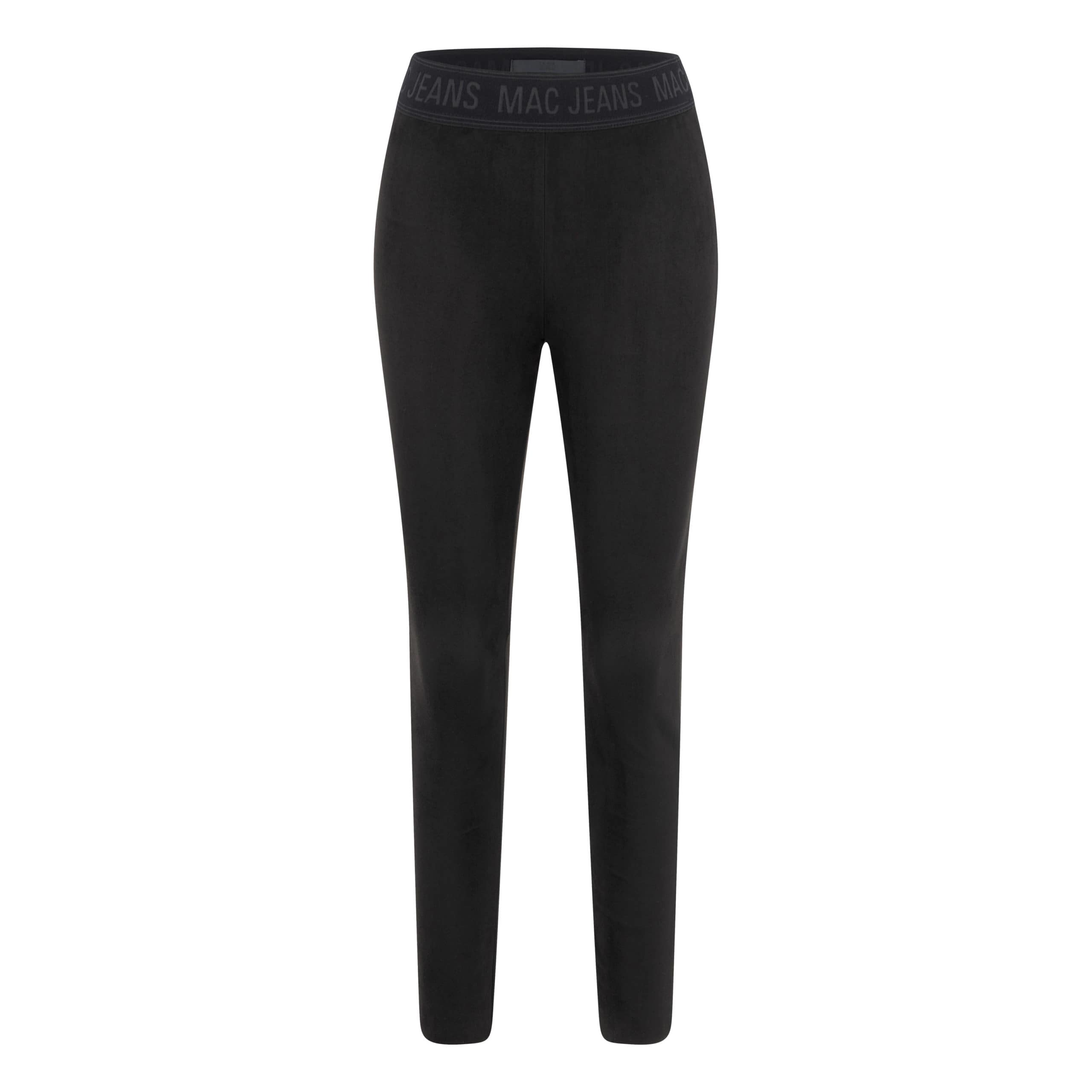 Legging van MAC Jeans, model Leggings. Deze zwarte broek heeft een aansluitende pasvorm met een elastische tailleband met logo. De legging is gemaakt van een zwarte fluwelen stof voor een suède look en heeft een onafgewerkte zoom.