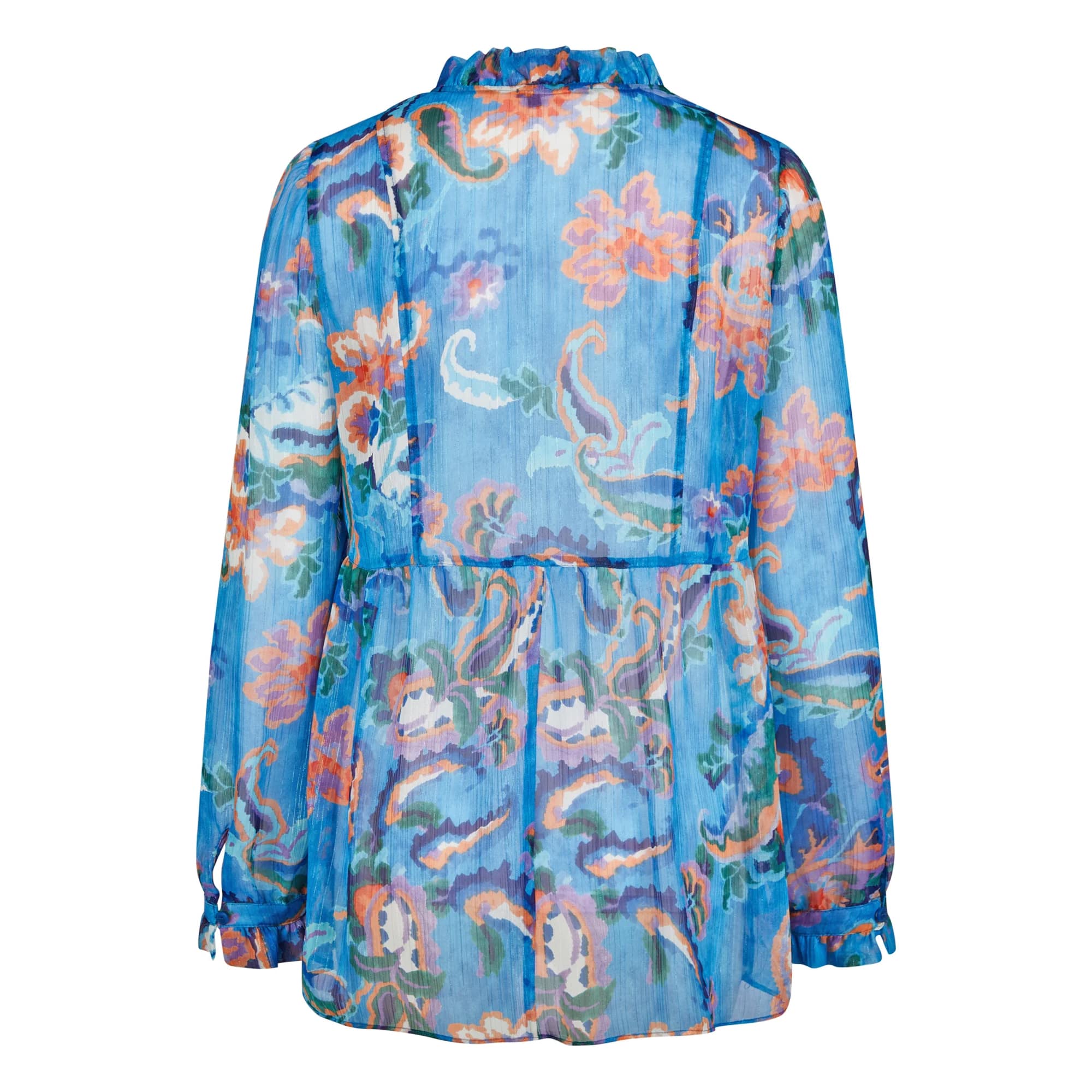 Blauwe blouse van Marc Aurel, model blouse with paisley print. Deze tuniek heeft een opstaande hals en sluit aan de voorzijde met lintjes. De blauwe blouse is gemaakt van een licht transparant stof met paisley print en een metalic draad en valt tot op de heup.