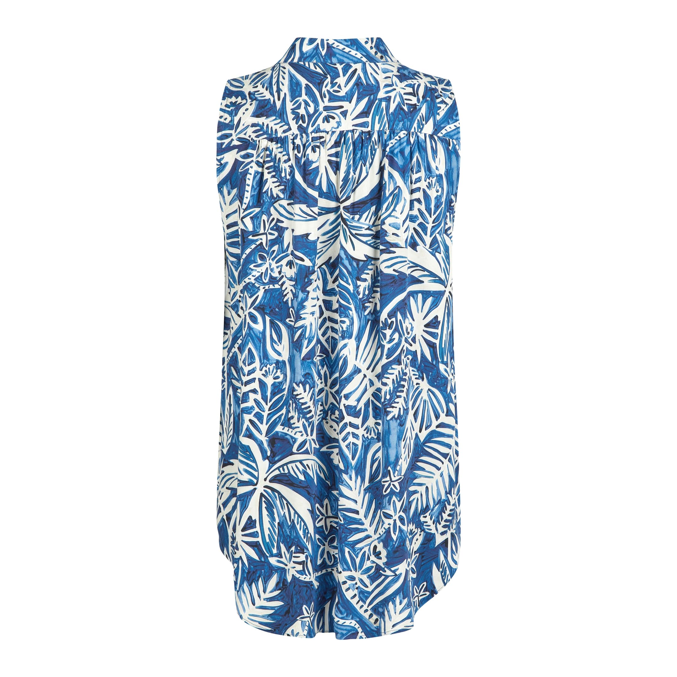 Blauw witte blouse top van Marc Aurel. Deze top is gemaakt van een witte stof met hierop een blauwe tekening van bloemen en bladeren. Aan de voorzijde sluit de top met een verborgen knoopsluiting. De top is mouwloos, heeft een los vallende pasvorm en sluit hoog in de hals.