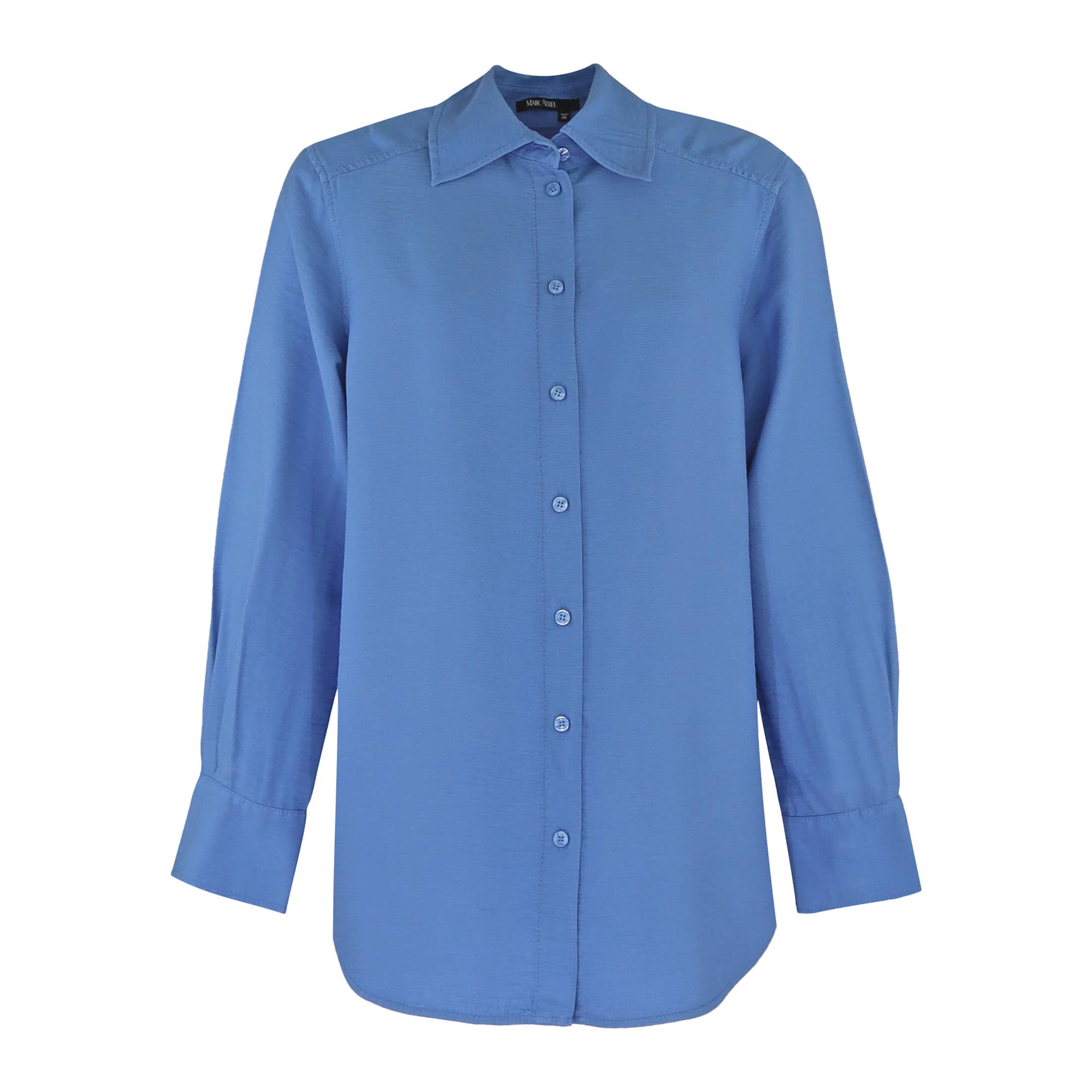 Blauwe blouse van Marc Aurel. Deze klassieke blouse sluit aan de voorzijde met een knoopsluiting en heeft een losvallende pasvorm. De effen blauwe blouse valt op de heup en heeft een iets langere achterzijde dan voorzijde.