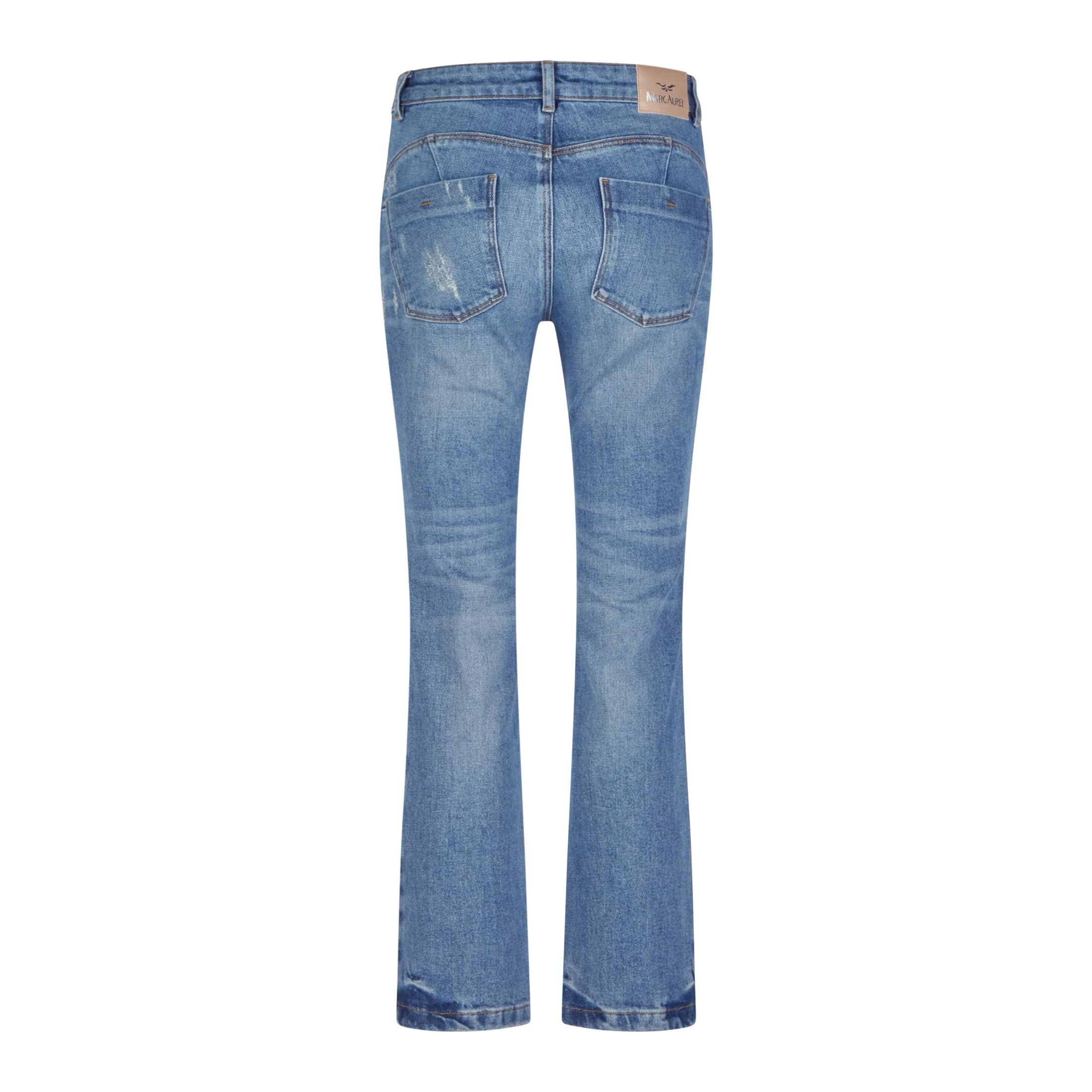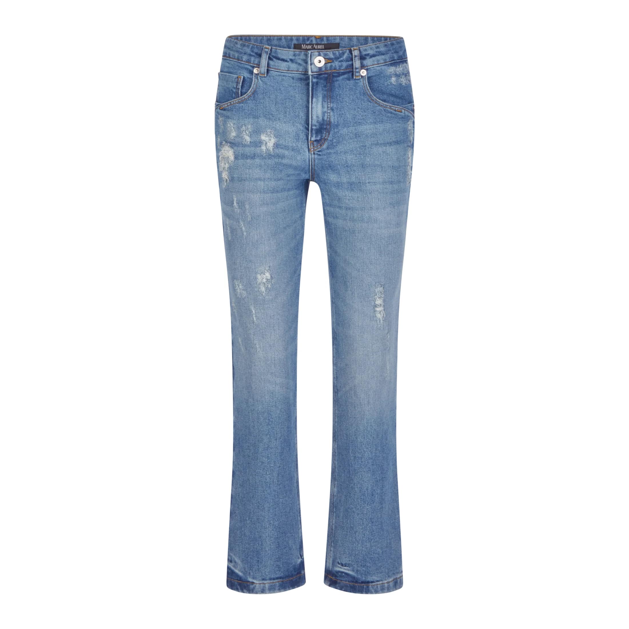 Blauwe jeans van Marc Aurel, model cropped flared jeans with comfort stretch in denim light washed. Deze broek is gemaakt van een denim stretch stof met beschadigingen en heeft een normale taille. De jeans heeft cropped flared pasvorm, sluit met een knoop- en ritssluiting, heeft twee steekzakken en twee achterzakken.
