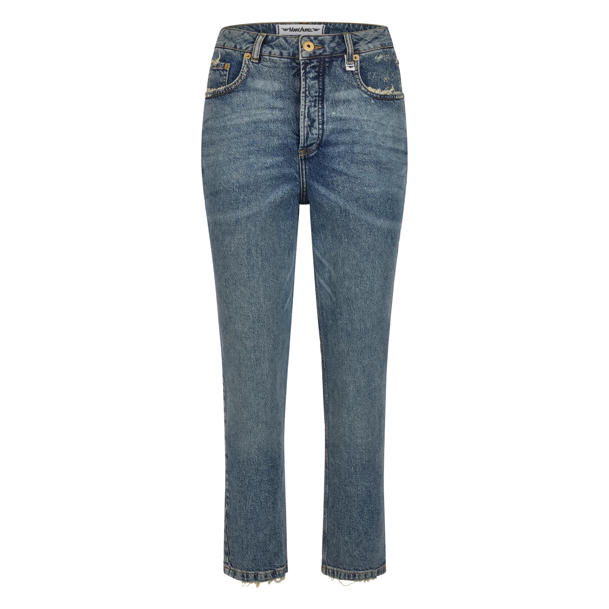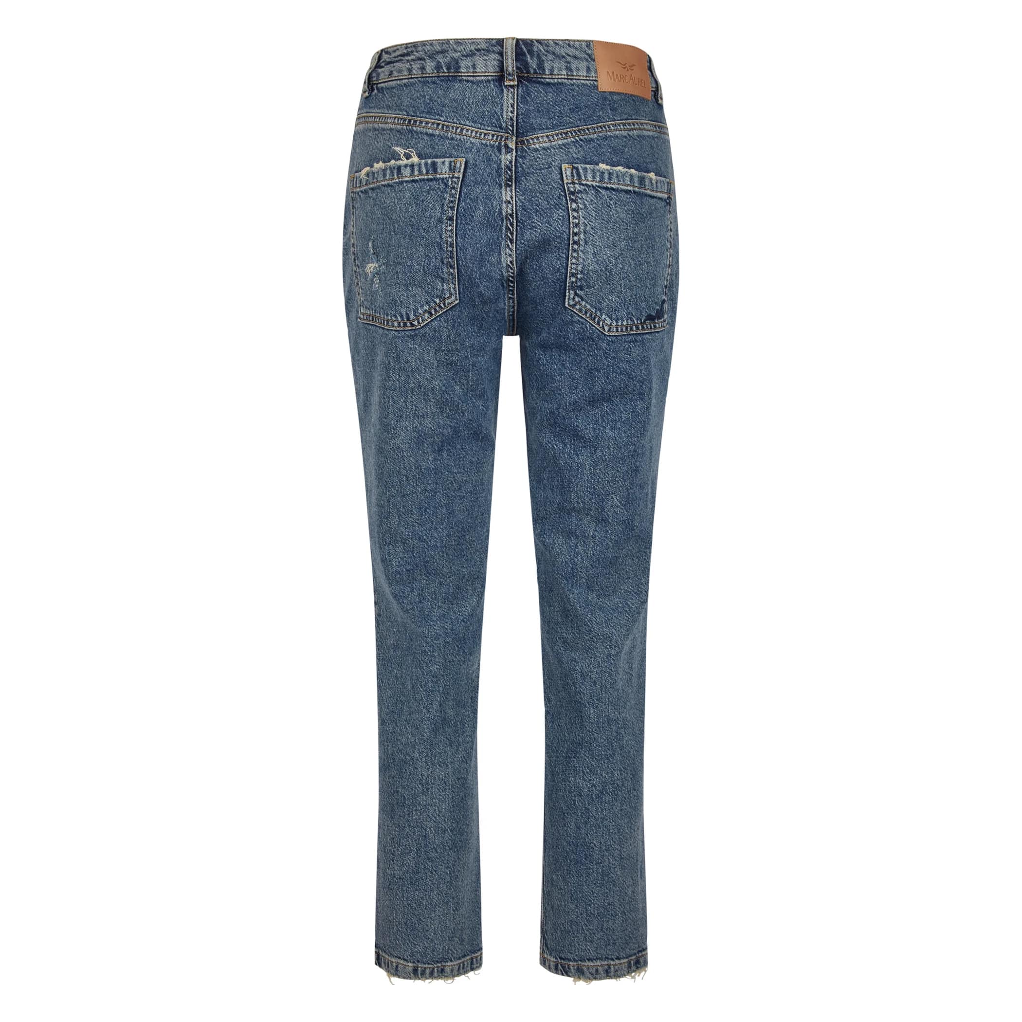 Blauwe jeans van Marc Aurel, model cropped mom jeans in blue denim. Deze broek is gemaakt van een denim stretch stof, heeft een hoge taille en rafels aan de onderzijde van de broekspijpen. De jeans heeft een loose fit pasvorm, sluit met een knoop- en ritssluiting, heeft twee steekzakken en twee achterzakken.