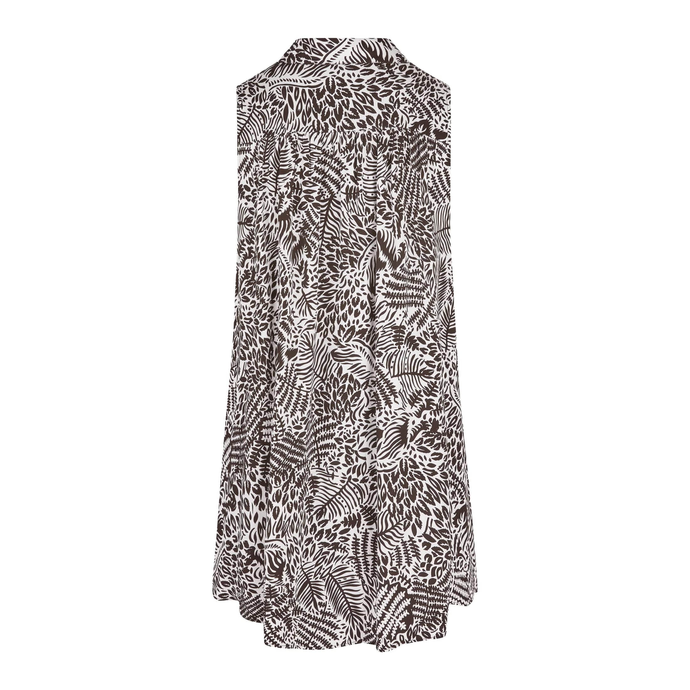 Blouse top van Marc Aurel. Deze top is gemaakt van een witte stof met een donkerbruine jungle print. Aan de voorzijde sluit de top met een verborgen knoopsluiting. De top is mouwloos, heeft een los vallende pasvorm en sluit hoog in de hals.