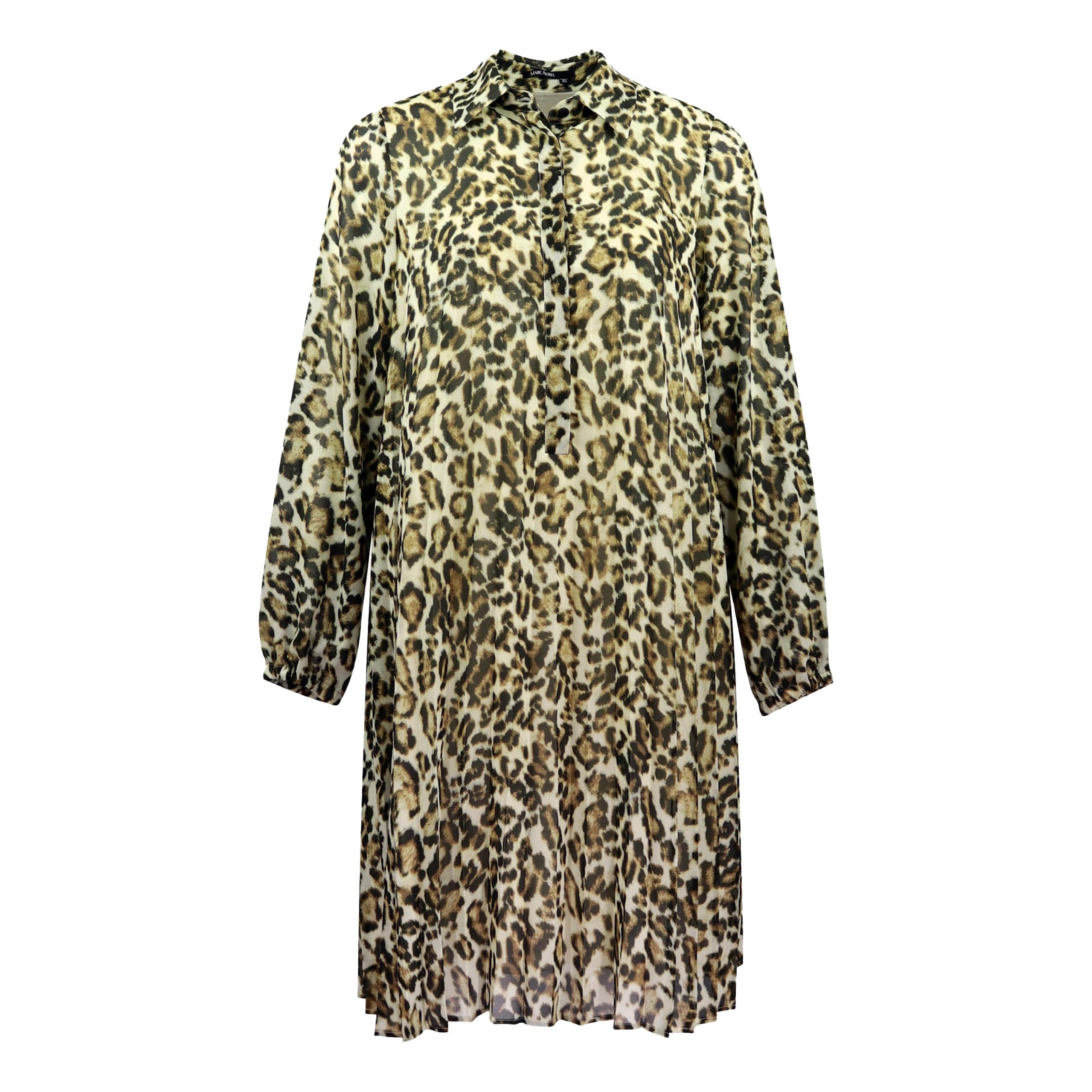 Blousekleedje van Marc Aurel. Deze jurk heeft een voering in de body en rok met overlay van plissé stof met een luipaarden print. De geplooide jurk sluit aan de voorzijde met een verborgen knoopsluiting en heeft een rechte pasvorm.