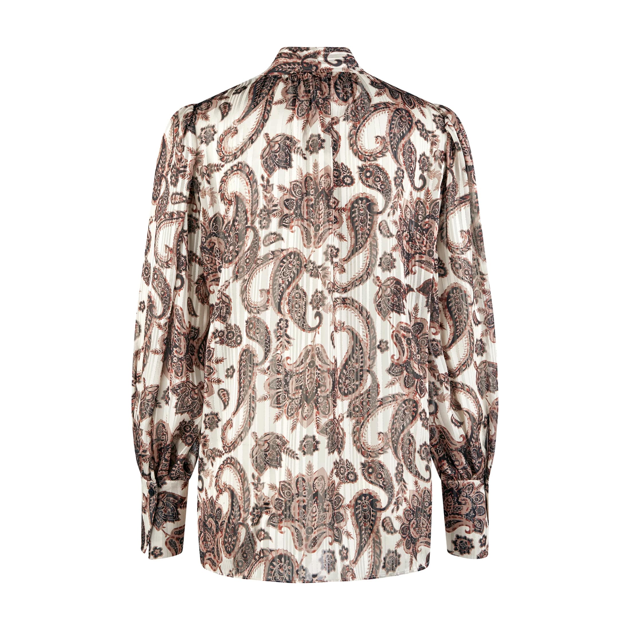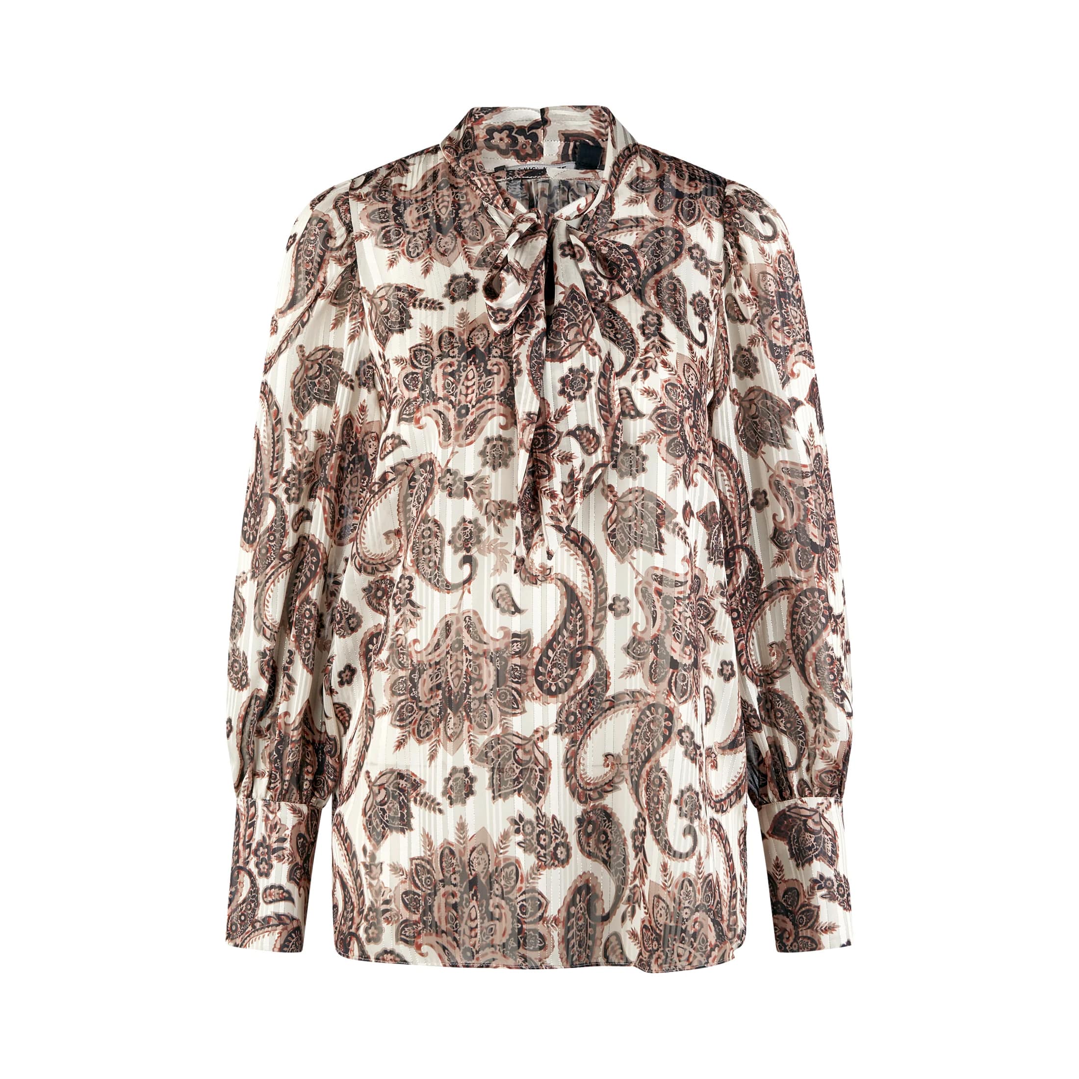Paisley blouse van Marc Aurel, model paisley print blouse in camel varied. Deze blouse is gemaakt van een paisley stof waar een metalic draad in rechte lijnen doorheen verweven is. De blouse heeft een losse pasvorm met aan de voorzijde een V-insnede met linten en lange mouwen.