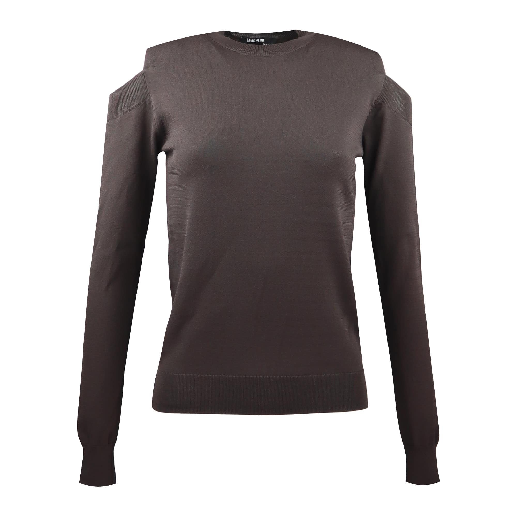 Bruine pull van Marc Aurel. Deze dunne trui is gemaakt van een fijn gebreide bruine stretch stof en heeft open schouders. De trui heeft een normale pasvorm met lange mouwen en een geribbelde ronde hals.
