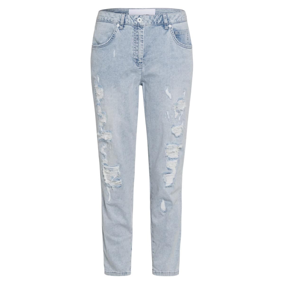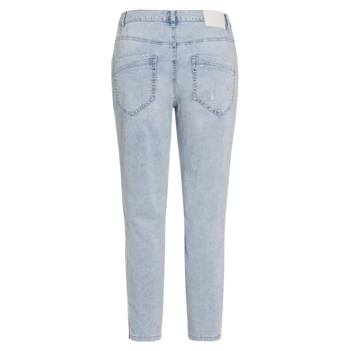 Lichtblauwe jeans van Marc Aurel. Deze destroyed broek is gemaakt van een denim stretch stof, heeft een normale taille en cropped broekspijpen. De jeans heeft een relaxte losse fit pasvorm en heeft aan de zijkanten een witte bies met dunne donkerblauwe strepen.