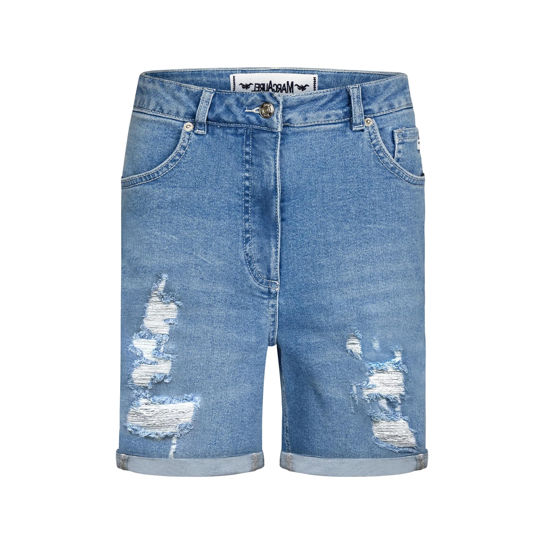 Blauwe denim short van Marc Aurel. Deze korte broek heeft een losse pasvorm, normale taille en is gemaakt van stretch denim met beschadigingen. De short sluit met een knoop- en ritssluiting, heeft twee steekzakken, gerafelde zoom en twee achterzakken.