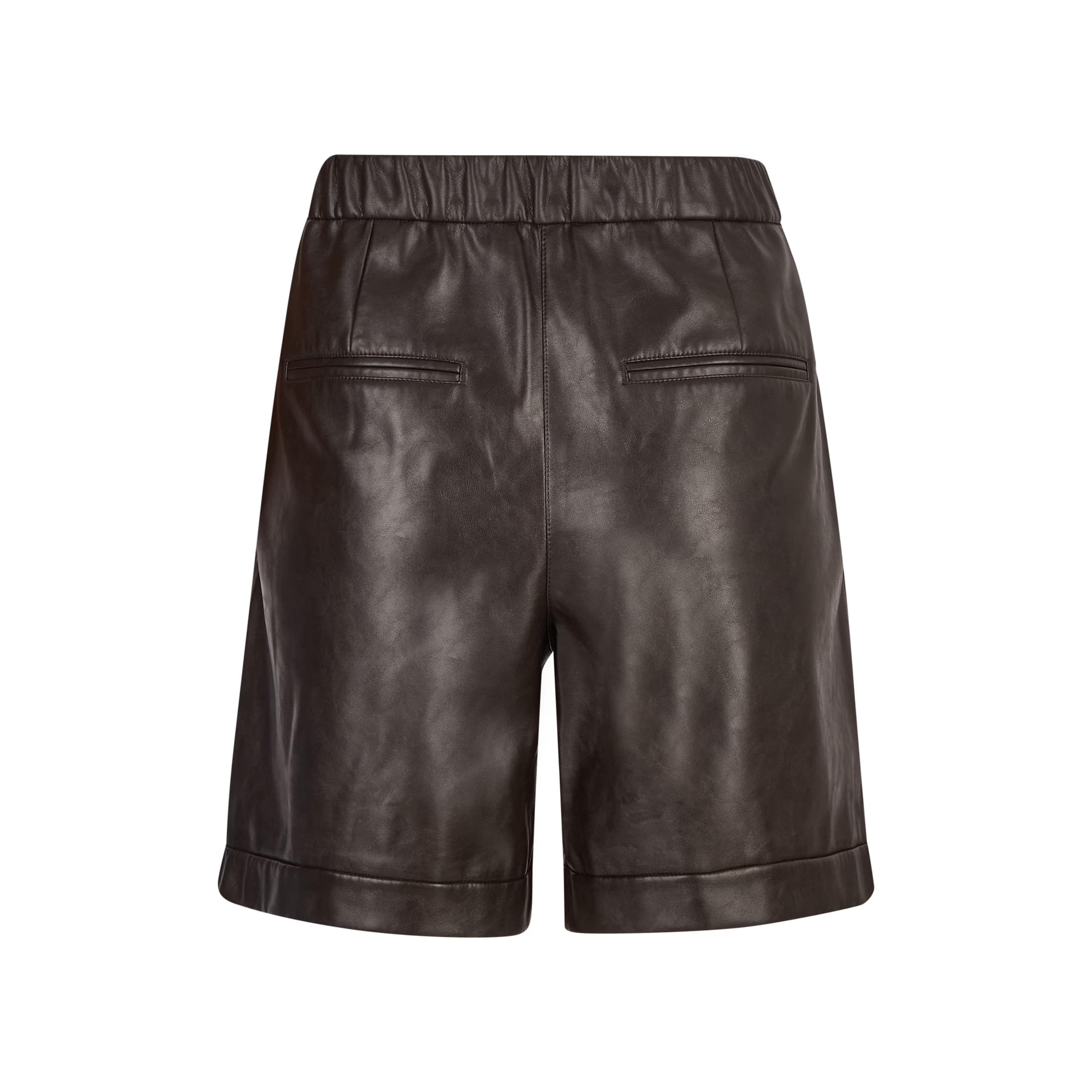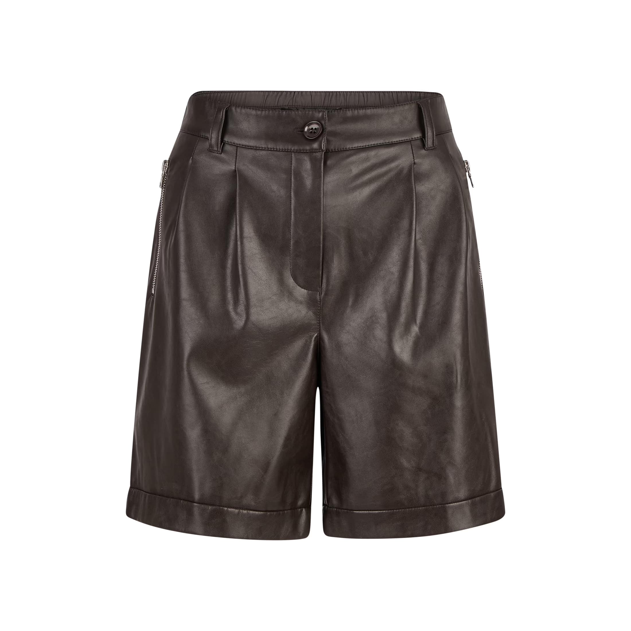Donkerbruine leerlook shorts van Marc Aurel. Deze korte broek heeft een losse pasvorm, normale taille en is gemaakt van vegan leather. De short sluit met een knoop- en ritssluiting, heeft twee steekzakken achter ritsjes en twee sierpaspel zakken.