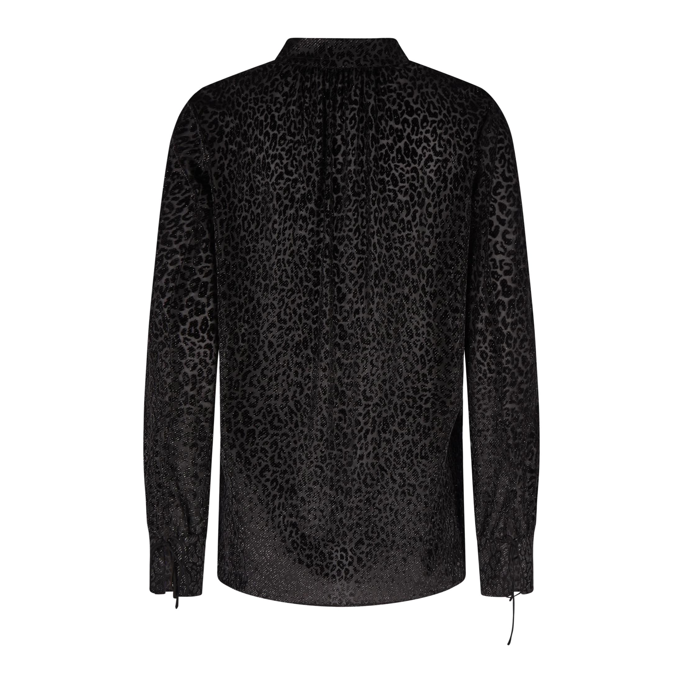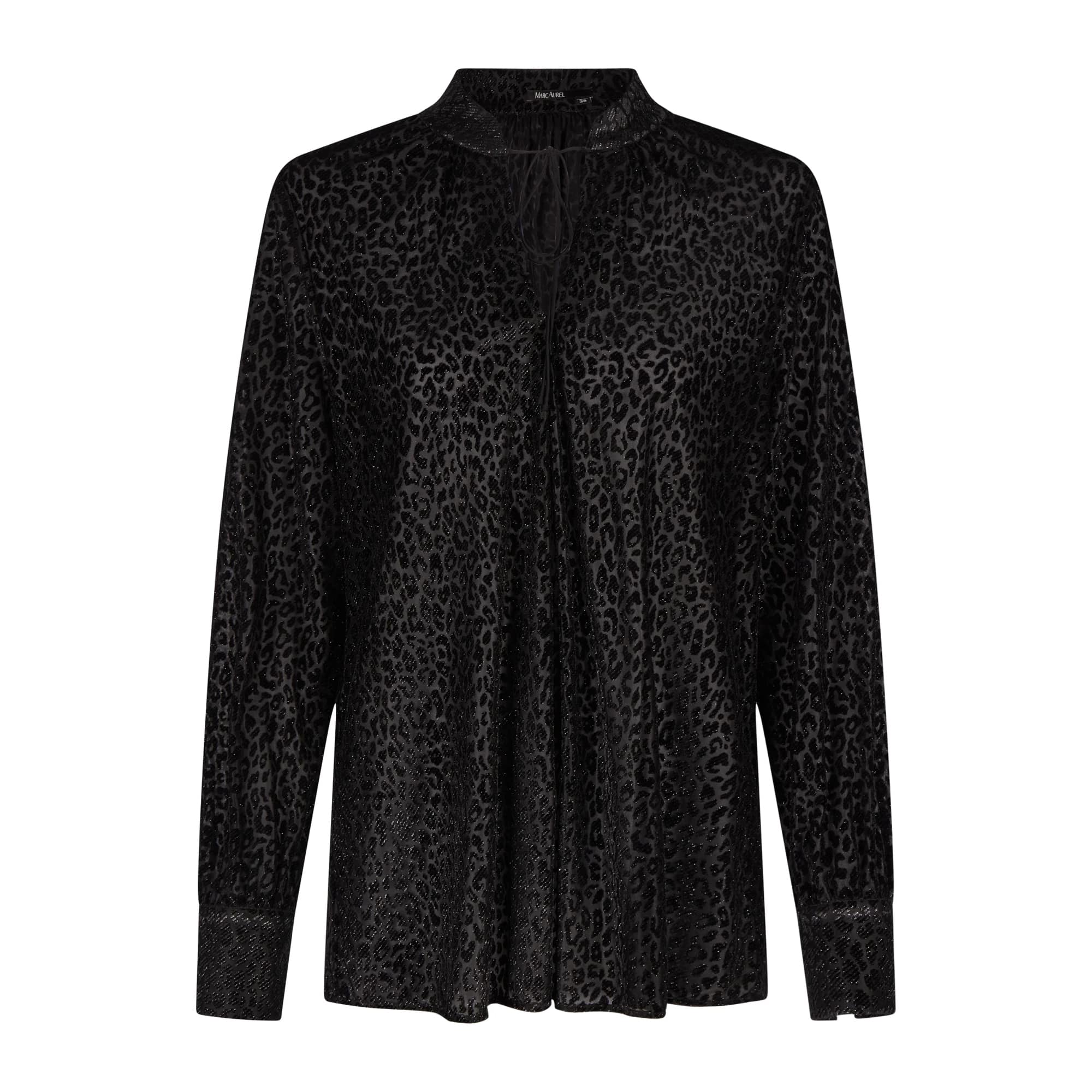 Zwarte fluwelen tuniek van Marc Aurel in luipaard print. Deze losvallende blouse heeft een fluwelen relief print met een metalic afwerking en kan aan de hals gesloten worden met een koordje. Deze zien we ook terug aan de manchetten.