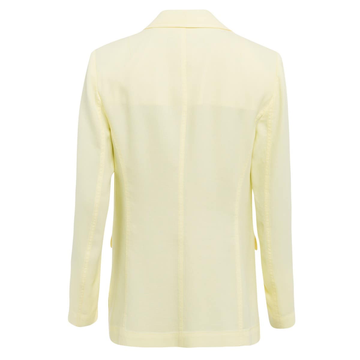 Gele blazer van Marc Aurel. Deze dunne blazer sluit aan de voorzijde met een knoop en heeft twee klepzakken aan de voorzijde. De blazer is gemaakt van een soepelvallende stof en heeft een rechte pasvorm.