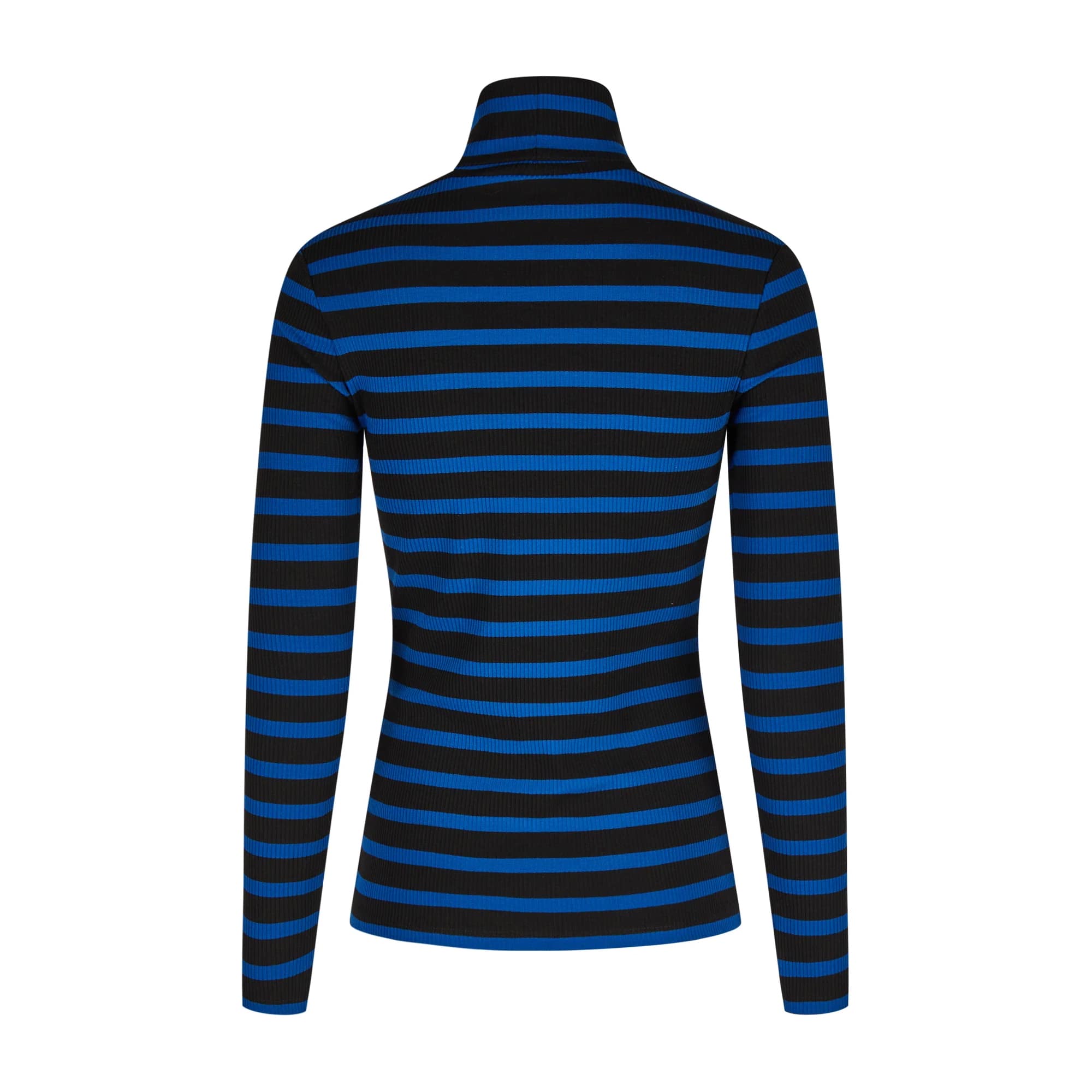 Blauw zwart gestreept shirt van Marc Aurel. Dit shirt is gemaakt van een fijn geribbelde stretch stof en heeft een aansluitende pasvorm. De top heeft een col en lange mouwen.