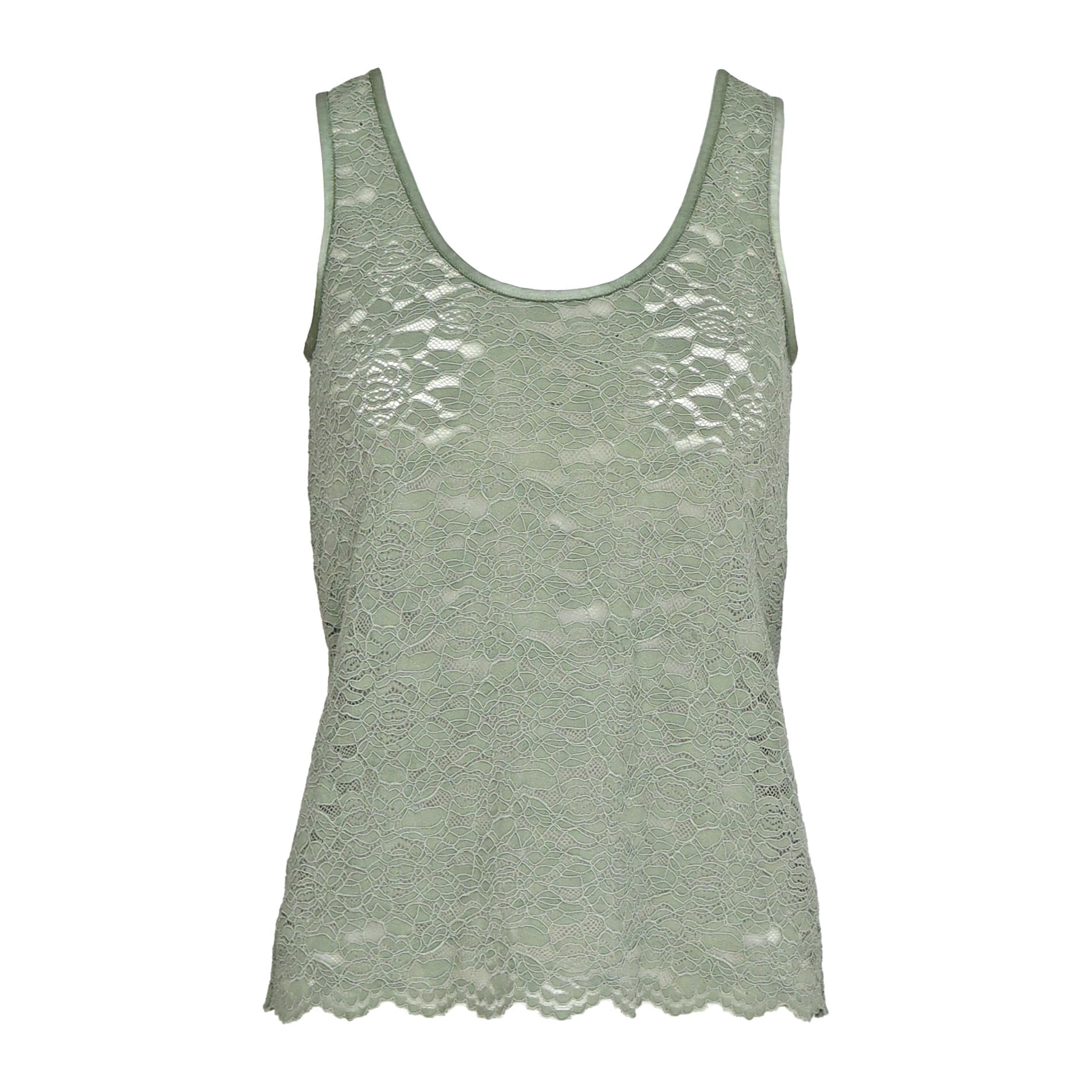 Kaki groene top van Marc Aurel. Deze top is gemaakt van een groene kanten stretch stof die doorschijnend is en heeft een normale pasvorm. De top heeft een ronde hals en is aan de hals en armsgaten afgezet met een strookje satijn.
