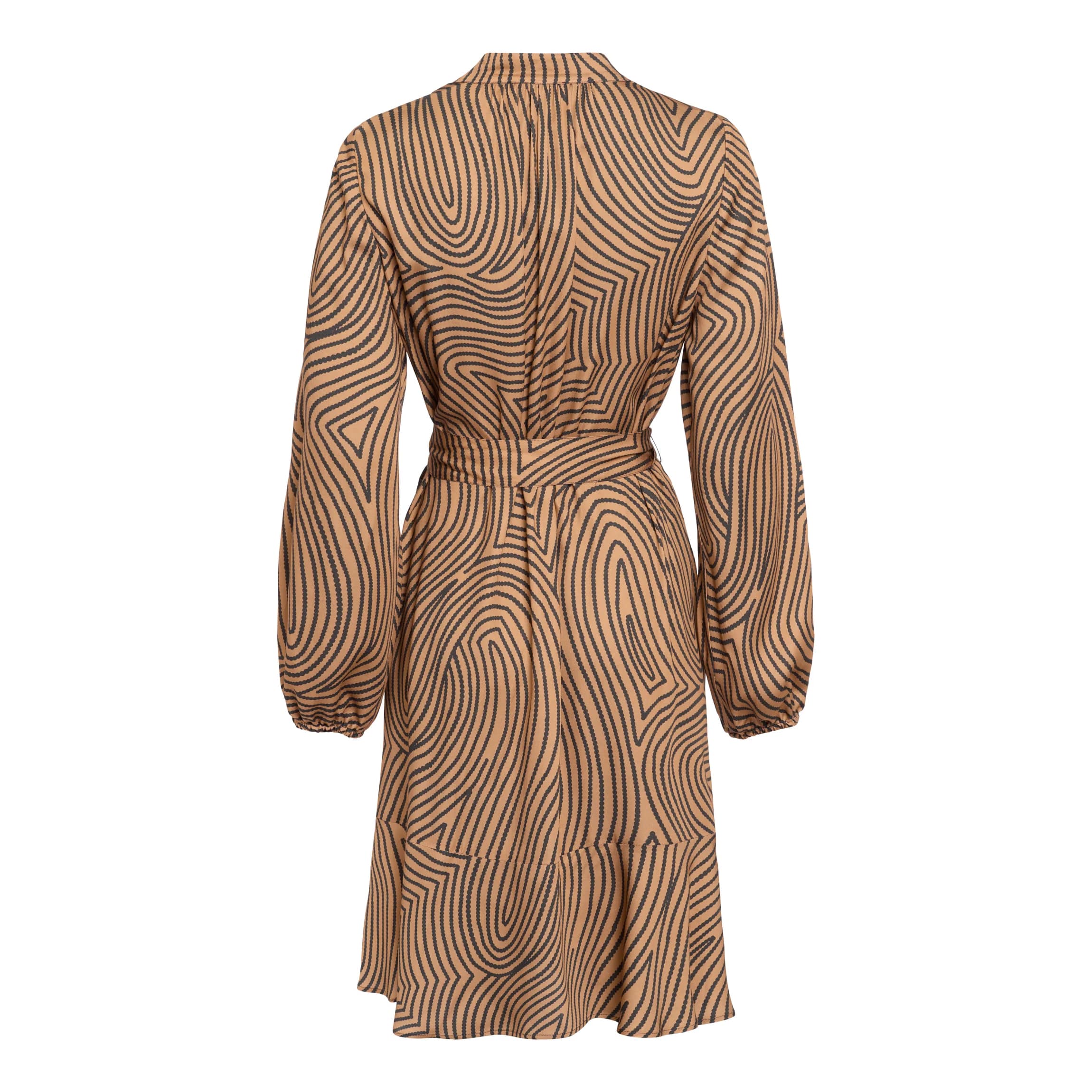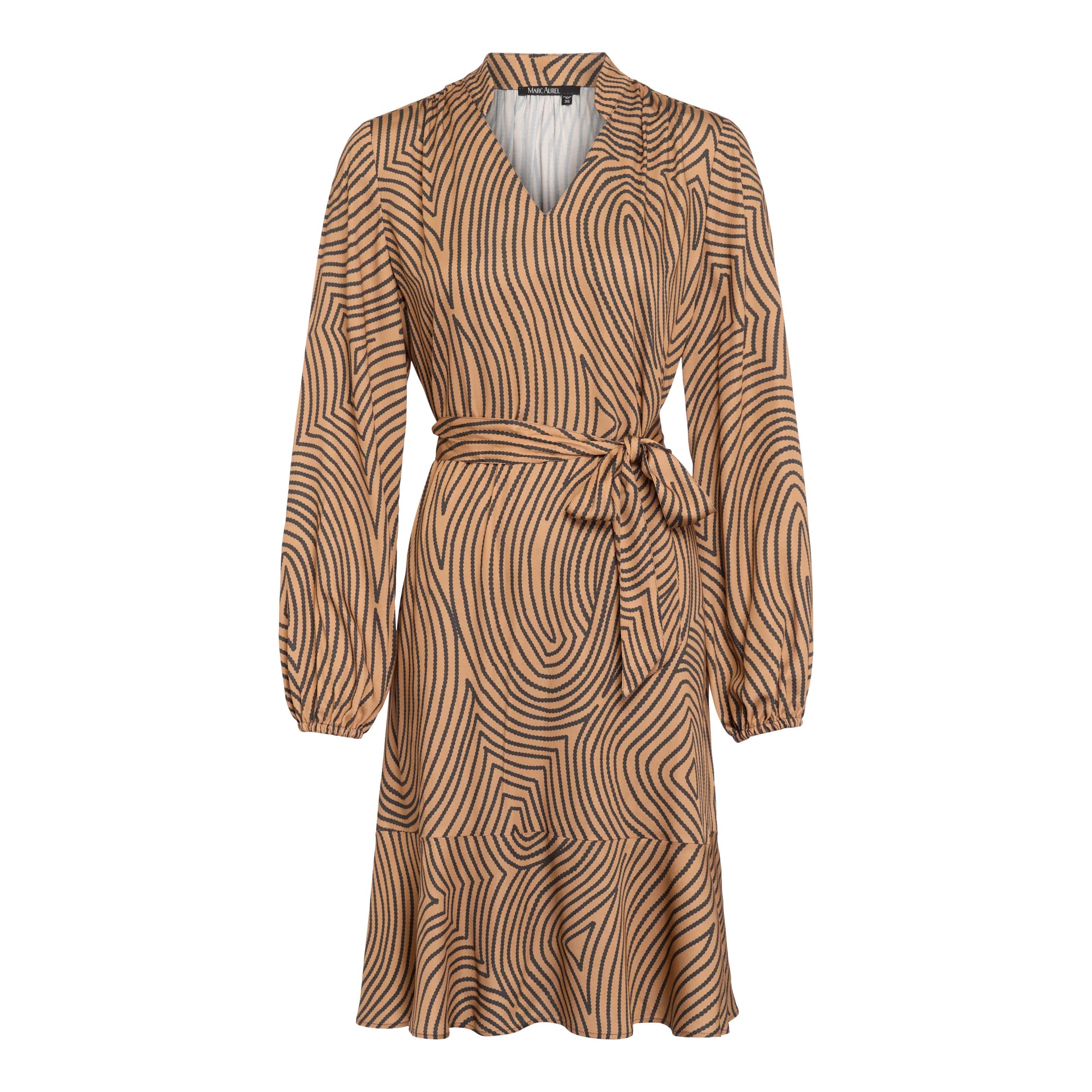 Bruin kleedje van Marc Aurel, model dress with graphic print in toffy varied. Deze jurk is gemaakt van een bruine viscose stof met een zwarte grafische print, heeft een rechte pasvorm met een bijpassende ceintuur om je taille te accentueren. De jurk heeft lange mouwen, elastische manchetten, V-hals en valt net boven de knie.