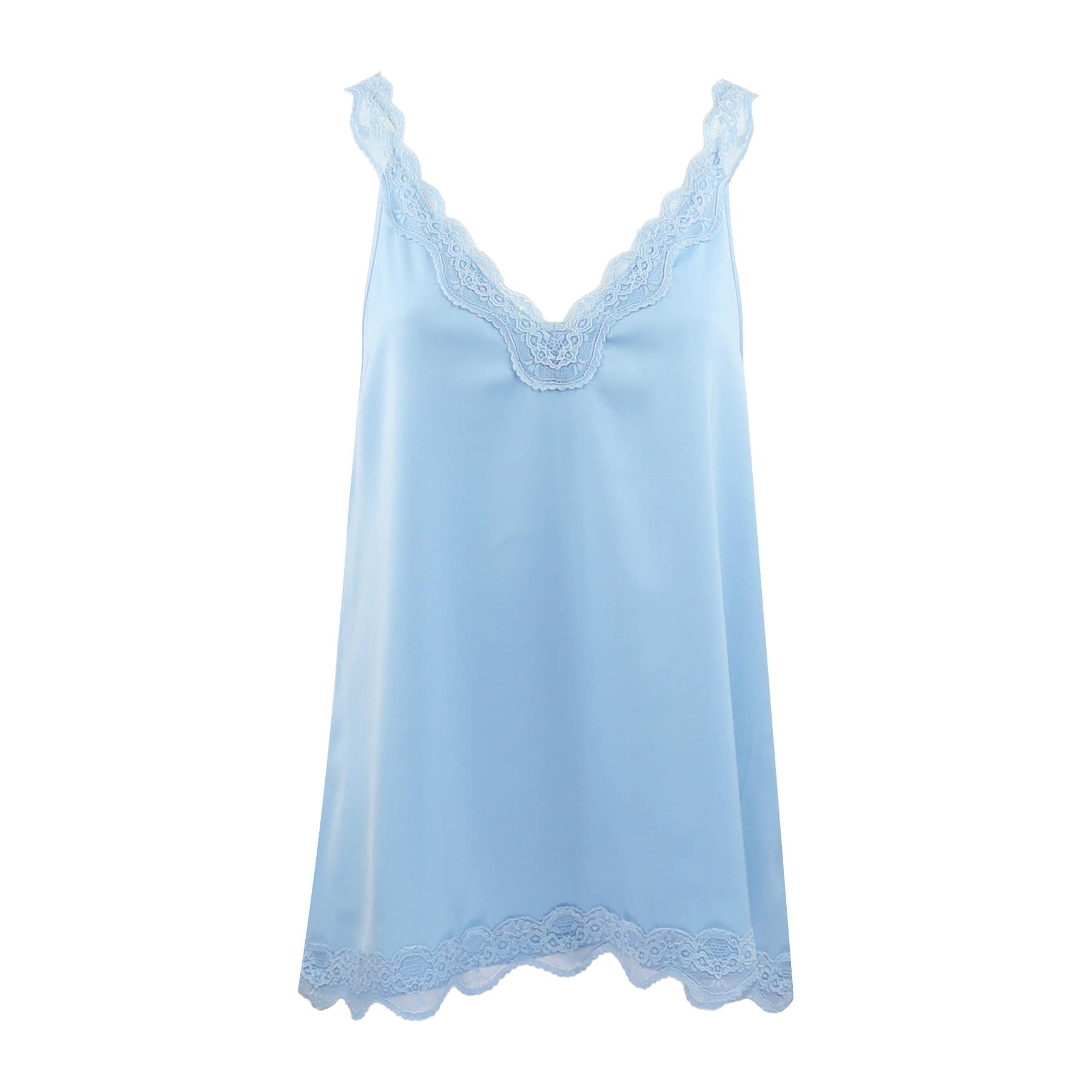 Lichtblauwe top van Marc Aurel in sky. Deze top is gemaakt van een lichtblauwe satijnen stof en heeft een uitlopende pasvorm. De top is aan de hals en zoom afgewerkt met een strook kant.