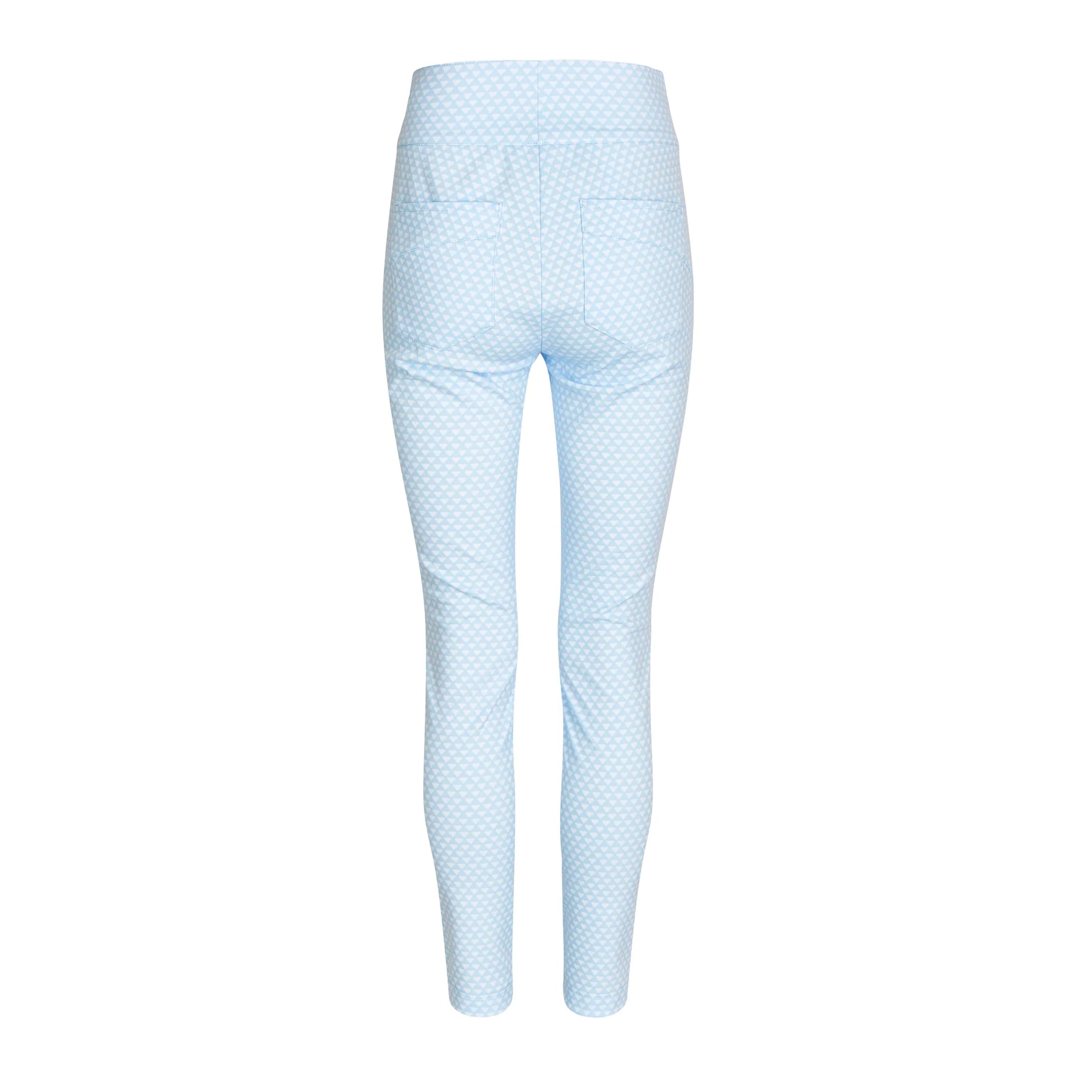 Lichtblauwe legging van Marc Aurel. Deze aansluitende broek is gemaakt van een stretch stof en heeft een hoge elastische taille. De legging is gemaakt van lichtblauwe stof met een wit driehoekje en heeft twee achterzakken.