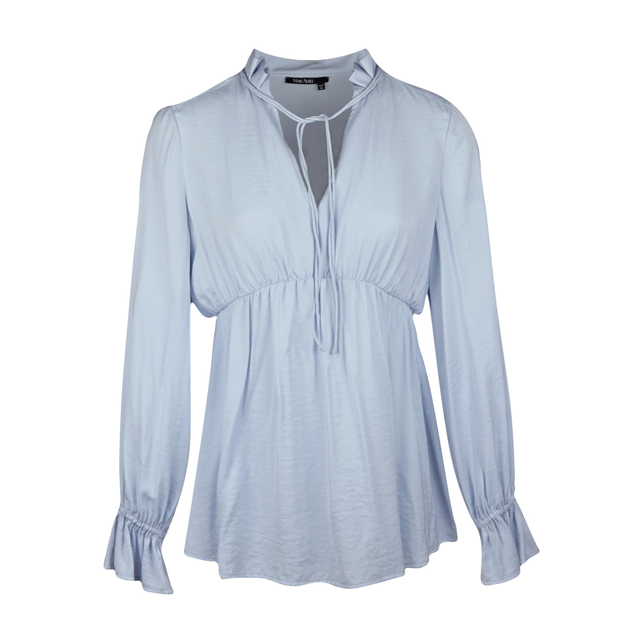 Lichtblauwe satijnen blouse van Marc Aurel. Deze losvallende blouse heeft een verhoogde elastische taille, elastische manchetten en een V-hals . De blouse kun je sluiten met koordjes aan de voorzijde.