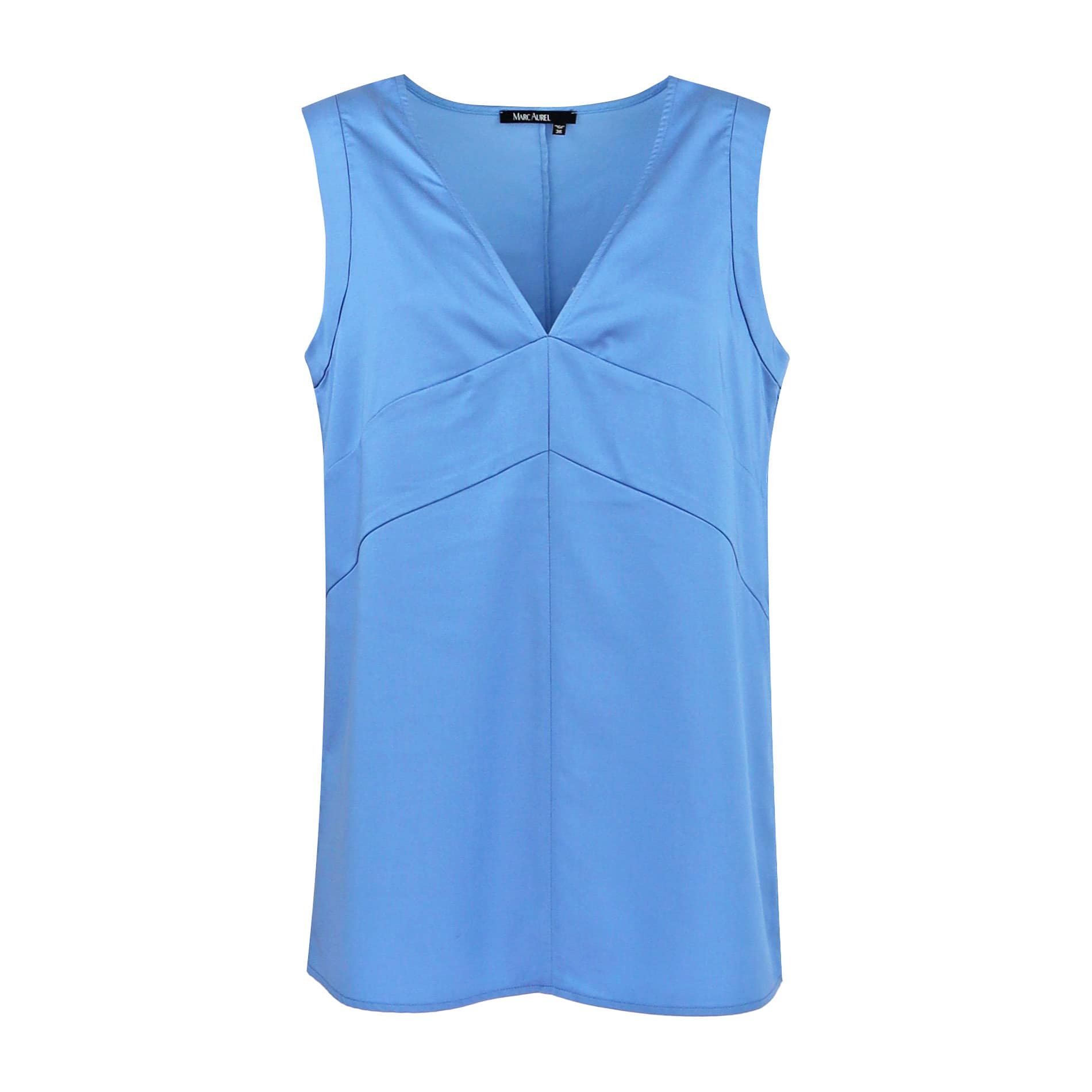 Lichtblauwe top van Marc Aurel. Deze top is gemaakt van een lyocell mix en heeft een effen lichtblauwe kleur. De top heeft een losse pasvorm, V-hals en is mouwloos.