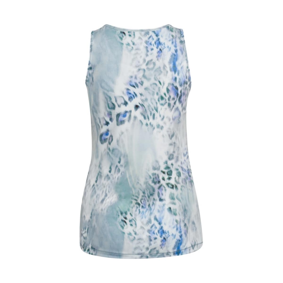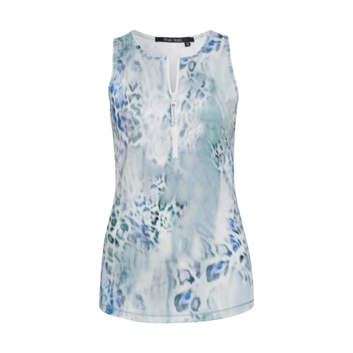 Sport top van Marc Aurel. Deze top is gemaakt van stretch stof en heeft een vervaagde blauw groene luipaard print. Aan de voorzijde sluit de top met een witte rits.