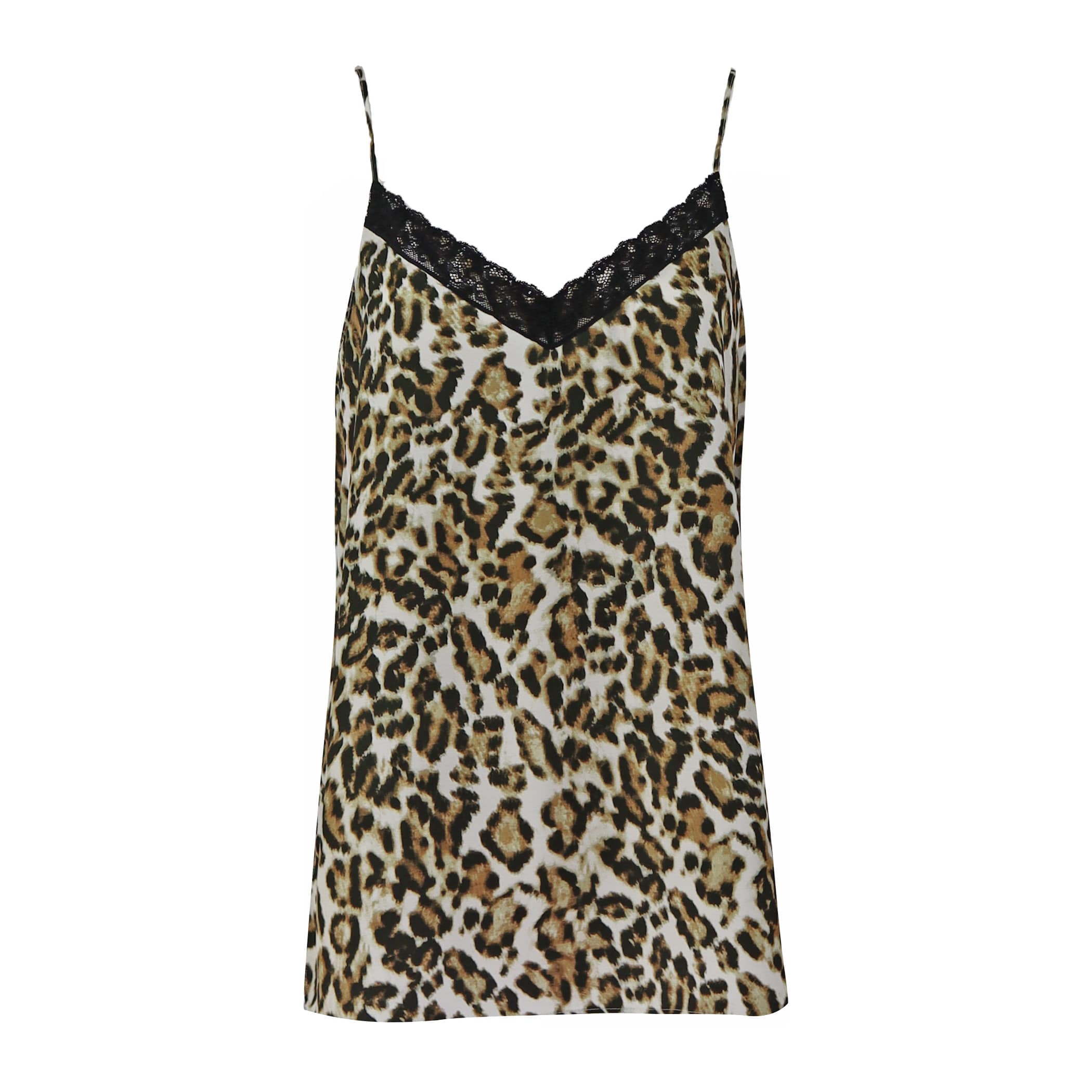 Luipaard top van Marc Aurel. Deze top is gemaakt van viscose met een luipaard print en heeft een kanten afwerking aan de hals. De top heeft een uitlopende pasvorm en verstelbare spaghettibandjes.