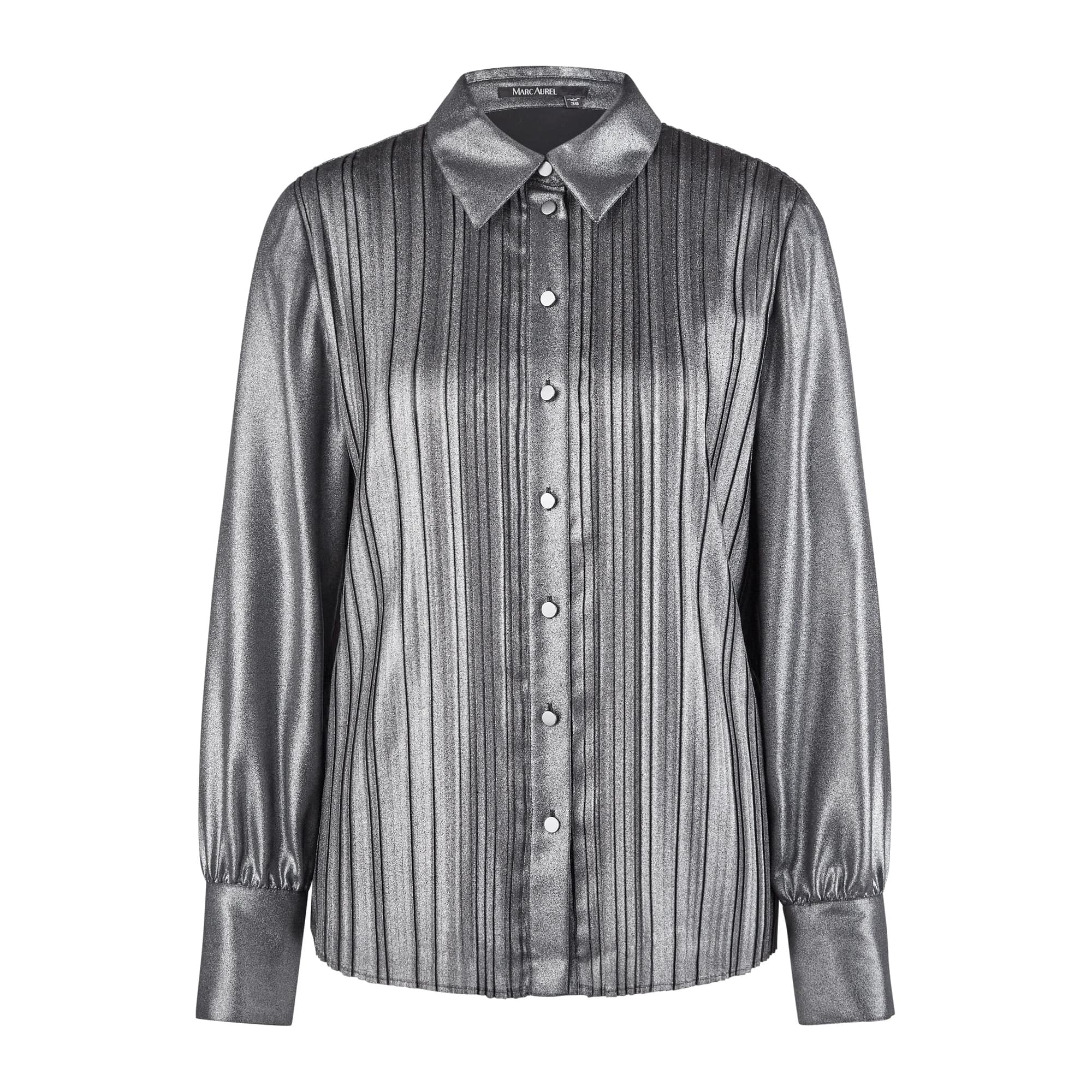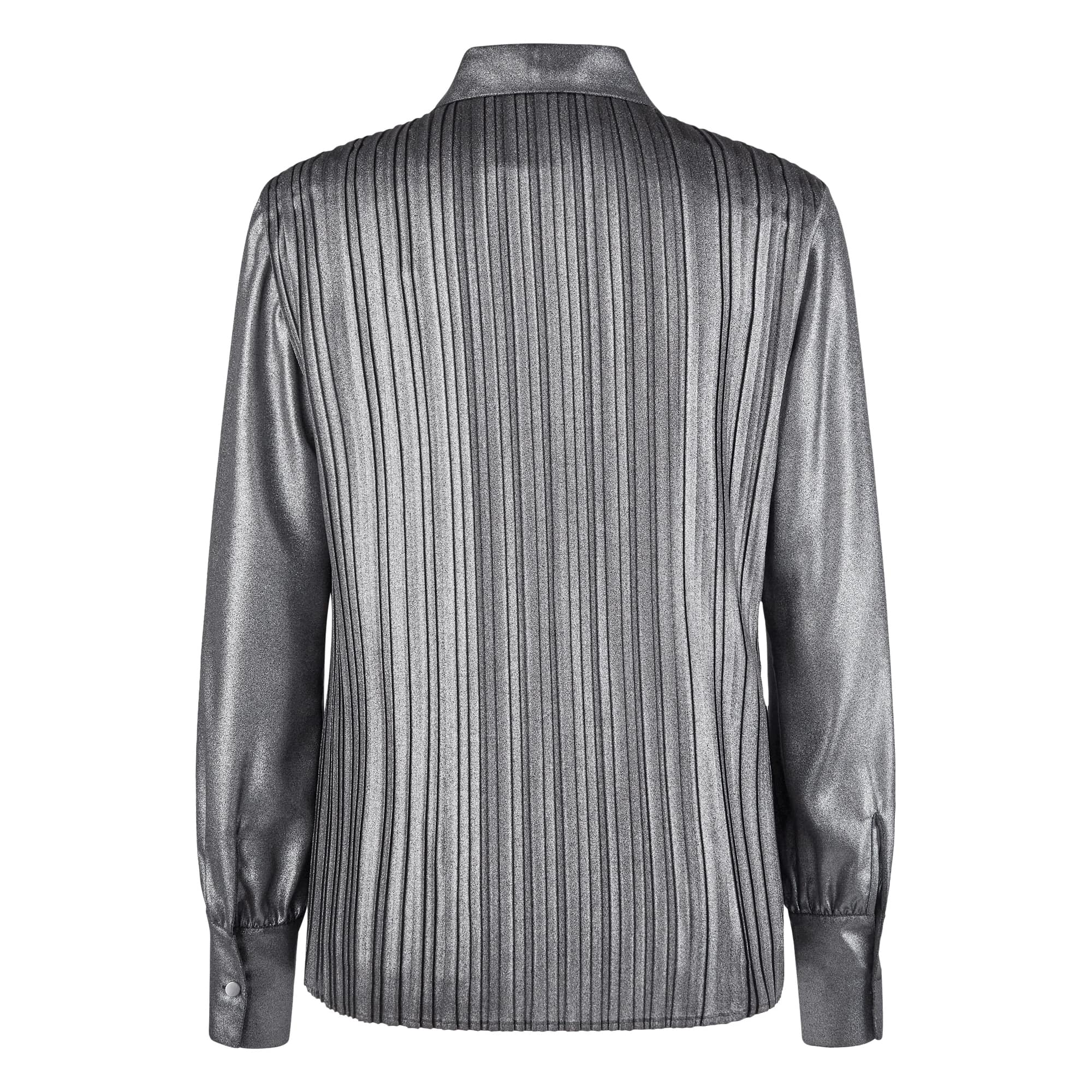 Metalic blouse van Marc Aurel. Deze geplooide blouse is gemaakt van een zwarte stof met een metalic zilveren coating. De plissé blouse sluit aan de vooorzijde met eensse kanten stroken in de mouwen en zoom van de blouse. De blouse heeft een los vallende pasvorm, lange mouwen en ronde hals met een V-insnede die gesloten kan worden met linten.