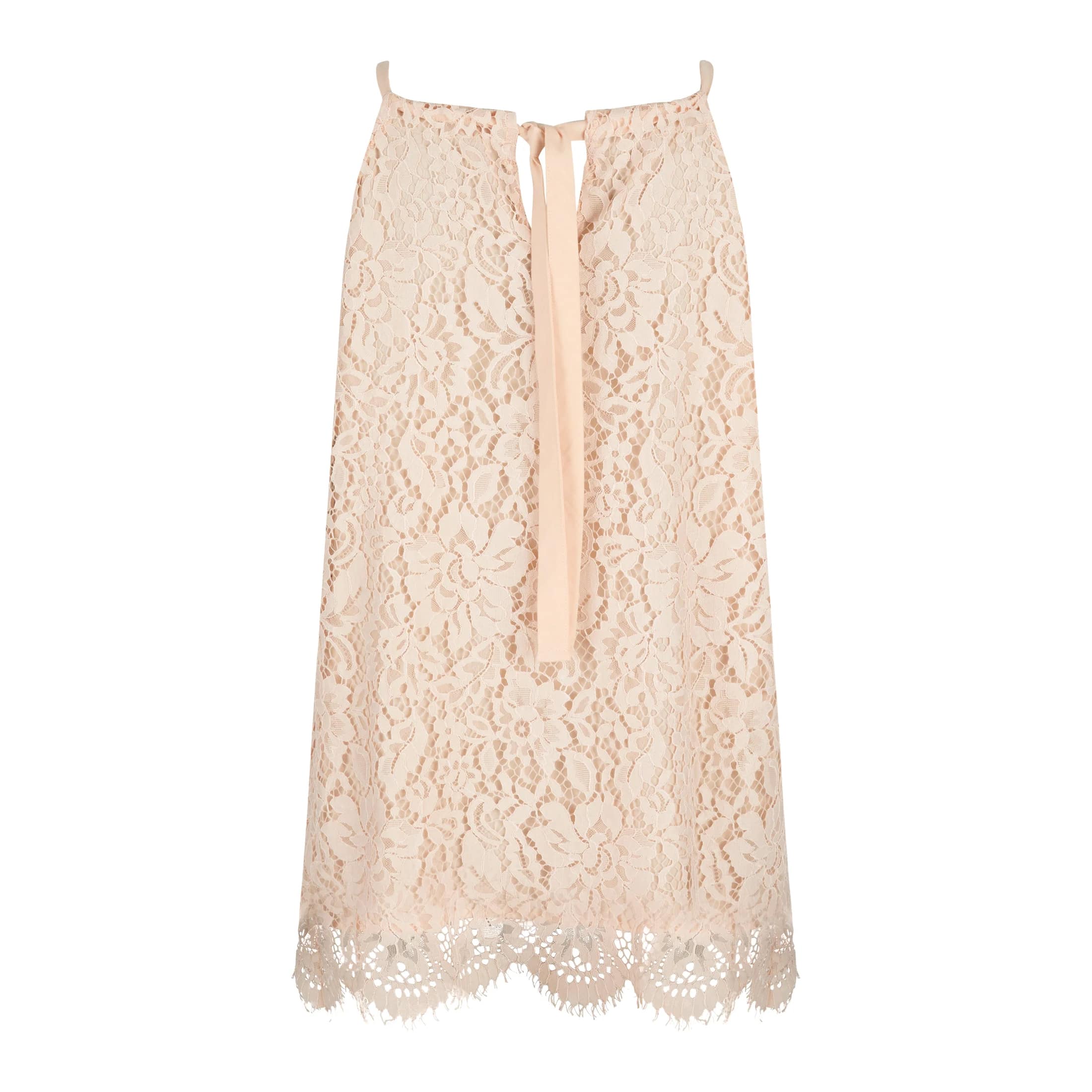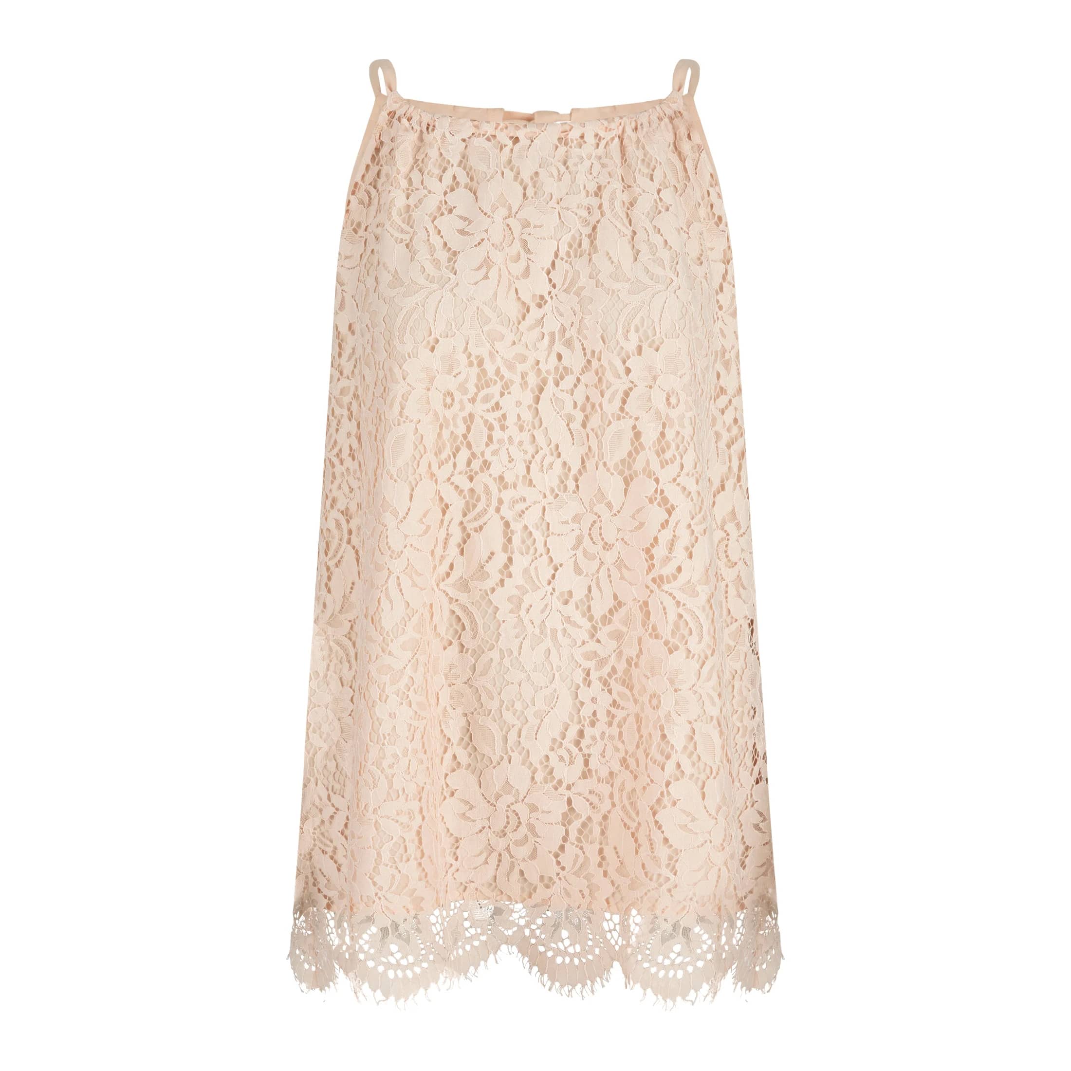Kanten top van Marc Aurel. Deze licht roze top heeft een los vallende uitlopende pasvorm en is mouwloos. De top is gevoerd, heeft een halter hals die je op jouw maat kunt maken door een lint dat op de rug in een strik gelegd kan worden.