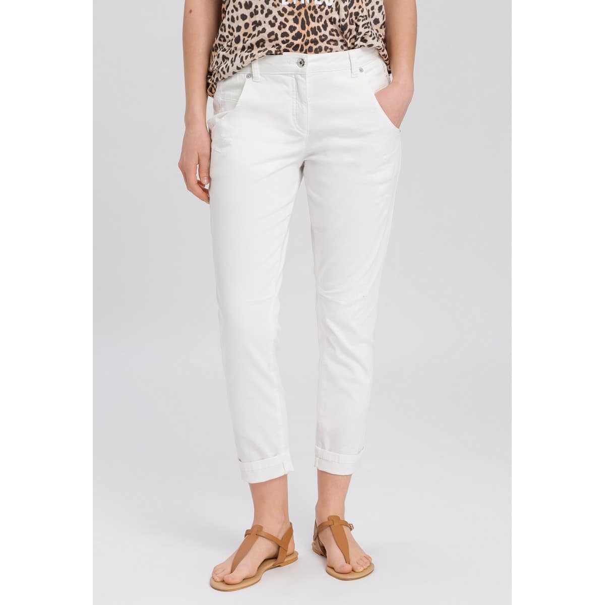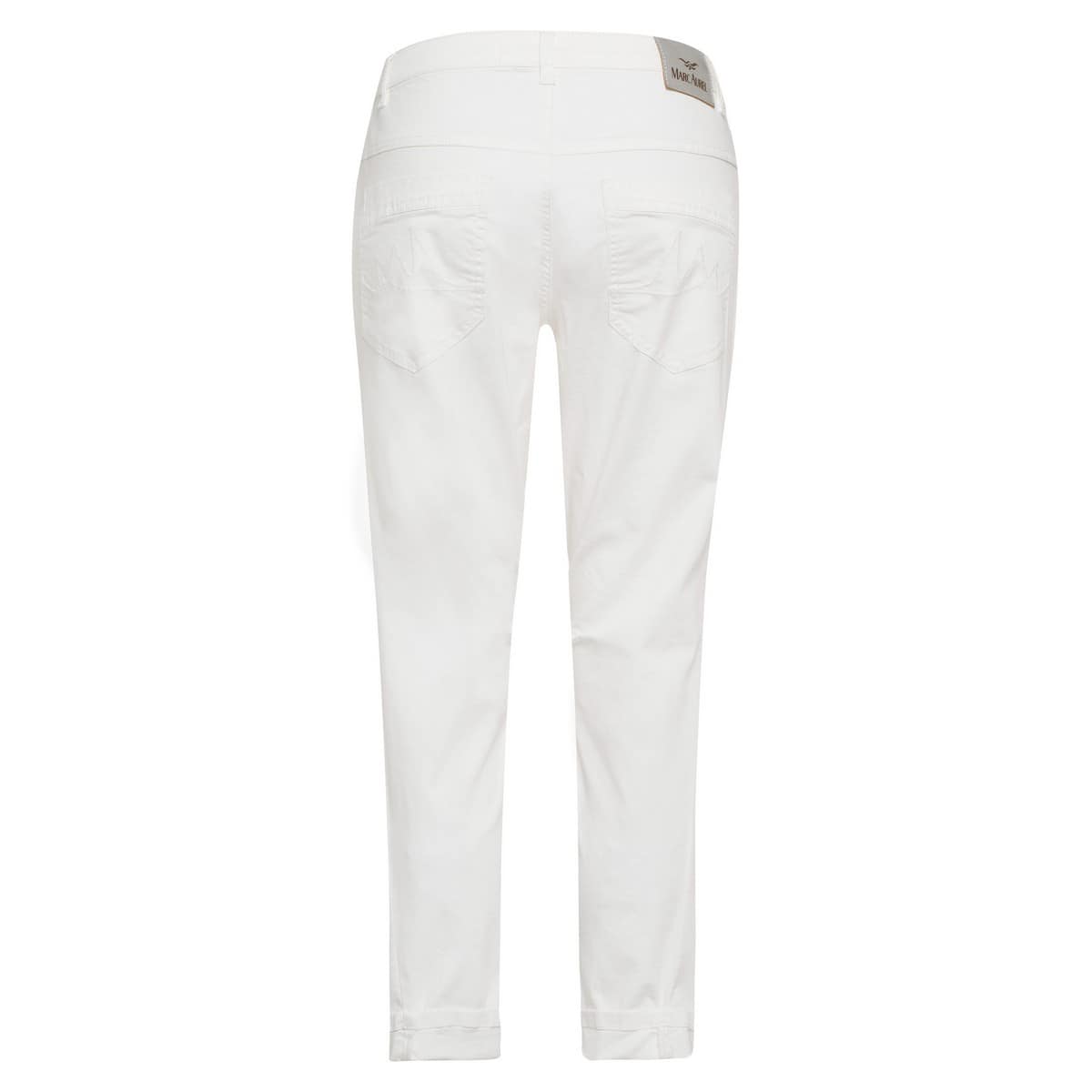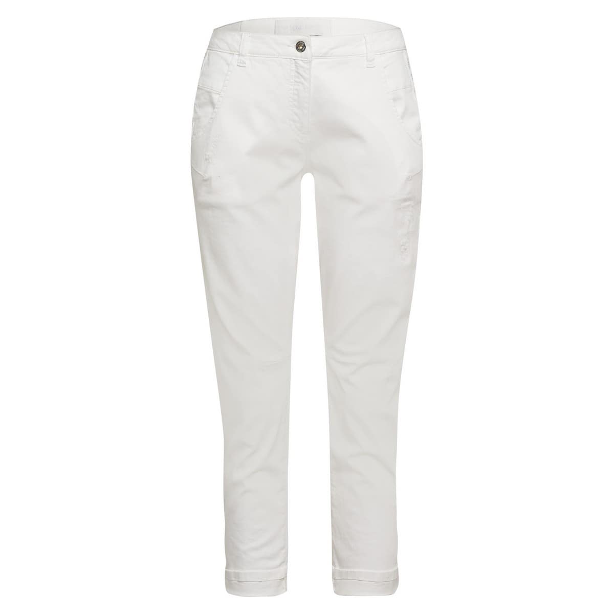 Off-white broek van Marc Aurel. Deze lange broek is gemaakt van een katoenen stretch stof, heeft een normale taille en cropped broekspijpen met een omslag. De broek heeft aan de voorzijde bij de grote steekzakken decoratieve beschadigingen en een bies met de tekst never underestimate the power of women.